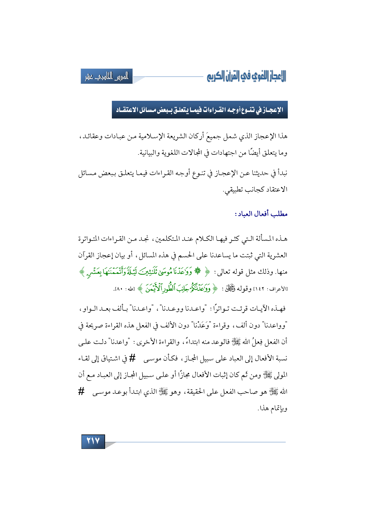 فهذه الآيات قرئت تواترًا: "واعدنا ووعدنا"، "واعدنا" بألف بعد الواو، "وواعدنا" دون ألف، وقراءة "وَعَدْنا" دون الألف في الفعل هذه القراءة صريحة في أن الفعل فِعلُ الله -سبحانه وتعالى- فالوعد منه ابتداءً، والقراءة الأخرى: "واعدنا" دلت على نسبة الأفعال إلى العباد على سبيل المجاز، فكأن موسى -عليه السلام- في اشتياق إلى لقاء المولى -سبحانه وتعالى- ومن ثَم كان إثبات الأفعال مجازًا أو على سبيل المجاز إلى العباد مع أن الله -سبحانه وتعالى- هو صاحب الفعل على الحقيقة، وهو -سبحانه وتعالى- الذي ابتدأ بوعد موسى -عليه السلام- وبإتمام هذا.