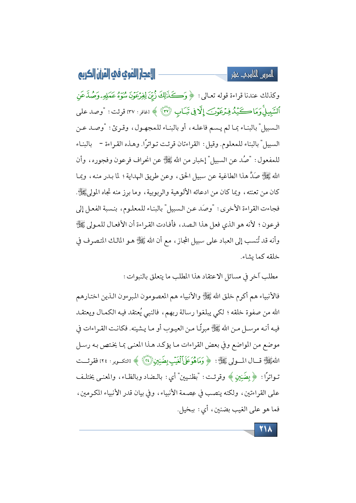 فالأنبياء هم أكرم خلق الله -سبحانه وتعالى- والأنبياء هم المعصومون المبرءون الذين اختارهم الله من صفوة خلقه؛ لكي يبلغوا رسالة ربهم، فالنبي يُعتقد فيه الكمال ويعتقد فيه أنه مرسل من الله -سبحانه وتعالى- مبرئًا من العيوب أو ما يشينه. فكانت القراءات في موضع من المواضع وفي بعض القراءات ما يؤكد هذا المعنى بما يختص به رسل الله -سبحانه وتعالى- قال المولى -سبحانه وتعالى-: {وَمَا هُوَ عَلَى الْغَيْبِ بِضَنِينٍ} (التكوير: 24) فقرئت تواترًا: {بِضَنِينٍ} وقرئت: "بظنيين" أي: بالضاد وبالظاء، والمعنى يختلف على القراءتين، ولكنه ينصب في عِصمة الأنبياء، وفي بيان قدر الأنبياء المكرمين، فما هو على الغيب بضنين، أي: ببخيل.