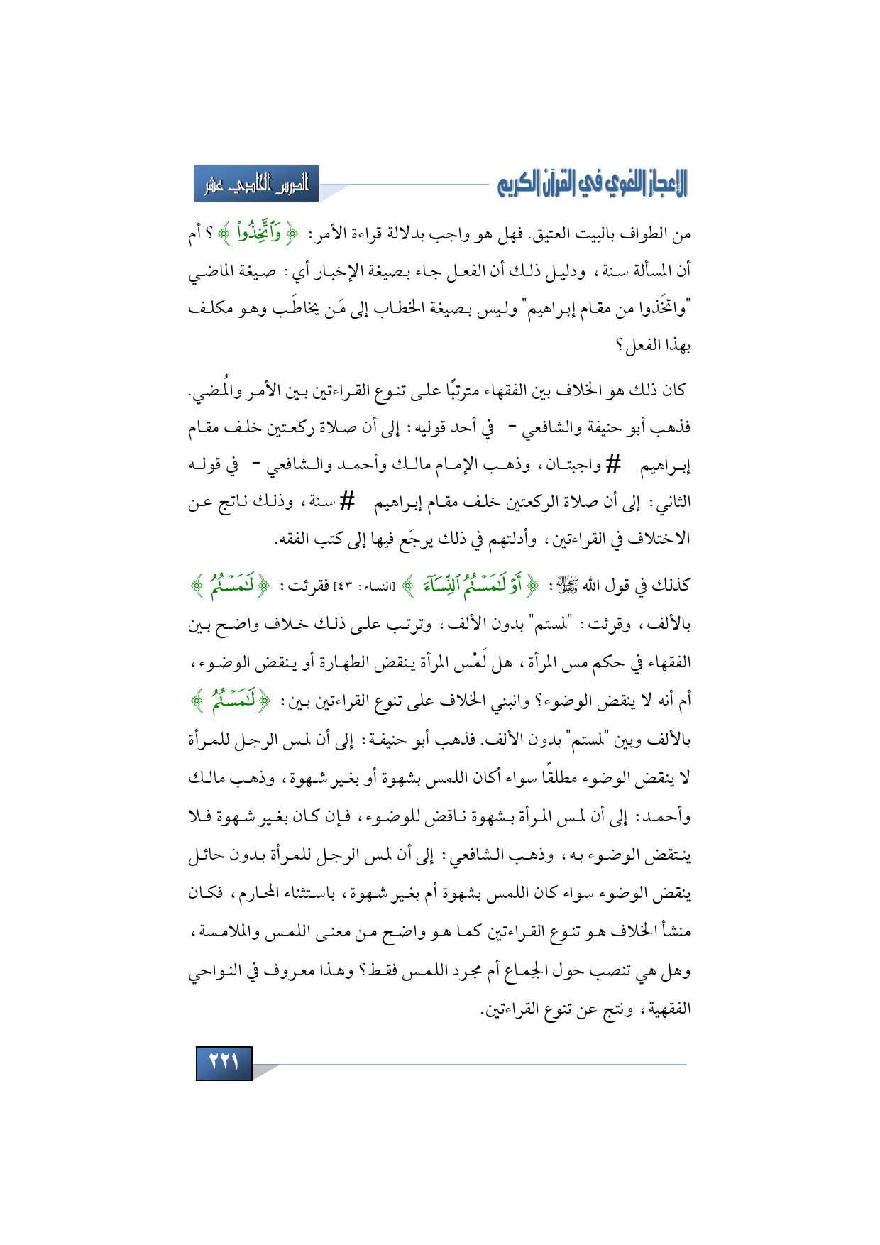 كذلك في قول الله -سبحانه وتعالى-: {أَوْ لَامَسْتُمُ النِّسَاءَ} (النساء: 43) فقرئت: {لَامَسْتُمُ} بالألف، وقرئت: "لمستم" بدون الألف، وترتب على ذلك خلاف واضح بين الفقهاء في حكم مس المرأة، هل لَمْس المرأة ينقض الطهارة أو ينقض الوضوء، أم أنه لا ينقض الوضوء؟ وانبني الخلاف على تنوع القراءتين بين: {لَامَسْتُمُ} بالألف وبين "لمستم" بدون الألف. فذهب أبو حنيفة: إلى أن لمس الرجل للمرأة لا ينقض الوضوء مطلقًا سواء أكان اللمس بشهوة أو بغير شهوة، وذهب مالك وأحمد: إلى أن لمس المرأة بشهوة ناقض للوضوء، فإن كان بغير شهوة فلا ينتقض الوضوء به، وذهب الشافعي: إلى أن لمس الرجل للمرأة بدون حائل ينقض الوضوء سواء كان اللمس بشهوة أم بغير شهوة، باستثناء المحارم، فكان منشأ الخلاف هو تنوع القراءتين كما هو واضح من معنى اللمس والملامسة، وهل هي تنصب حول الجِماع أم مجرد اللمس فقط؟ وهذا معروف في النواحي الفقهية، ونتج عن تنوع القراءتين.