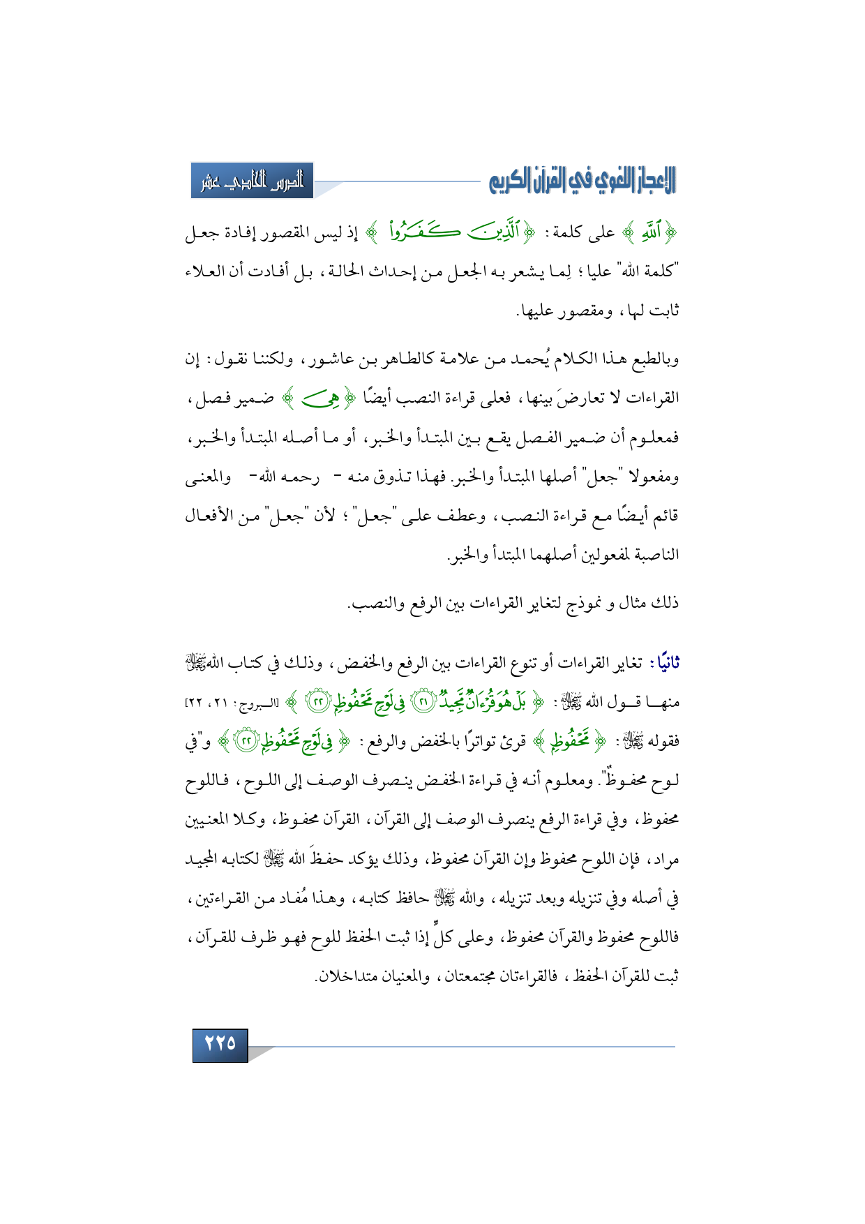 عندنا أيضًا تغاير القراءات أو تنوع القراءات بين الرفع والخفض، وذلك في كتاب الله -سبحانه وتعالى- منها قول الله -سبحانه وتعالى-: {بَلْ هُوَ قُرْآنٌ مَجِيدٌ * فِي لَوْحٍ مَحْفُوظٍ} (البروج: 21، 22) فقوله -سبحانه وتعالى-: {مَحْفُوظٍ} قرئ تواترًا بالخفض والرفع: {فِي لَوْحٍ مَحْفُوظٍ} و"في لوح محفوظٌ". ومعلوم أنه في قراءة الخفض ينصرف الوصف إلى اللوح، فاللوح محفوظ، وفي قراءة الرفع ينصرف الوصف إلى القرآن، القرآن محفوظ، وكلا المعنيين مراد، فإن اللوح محفوظ وإن القرآن محفوظ، وذلك يؤكد حفظَ الله -سبحانه وتعالى- لكتابه المجيد في أصله وفي تنزيله وبعد تنزيله، والله -سبحانه وتعالى- حافظ كتابه، وهذا مُفاد من القراءتين، فاللوح محفوظ والقرآن محفوظ، وعلى كلٍّ إذا ثبت الحفظ للوح فهو ظرف للقرآن، ثبت للقرآن الحفظ، فالقراءتان مجتمعتان، والمعنيان متداخلان.