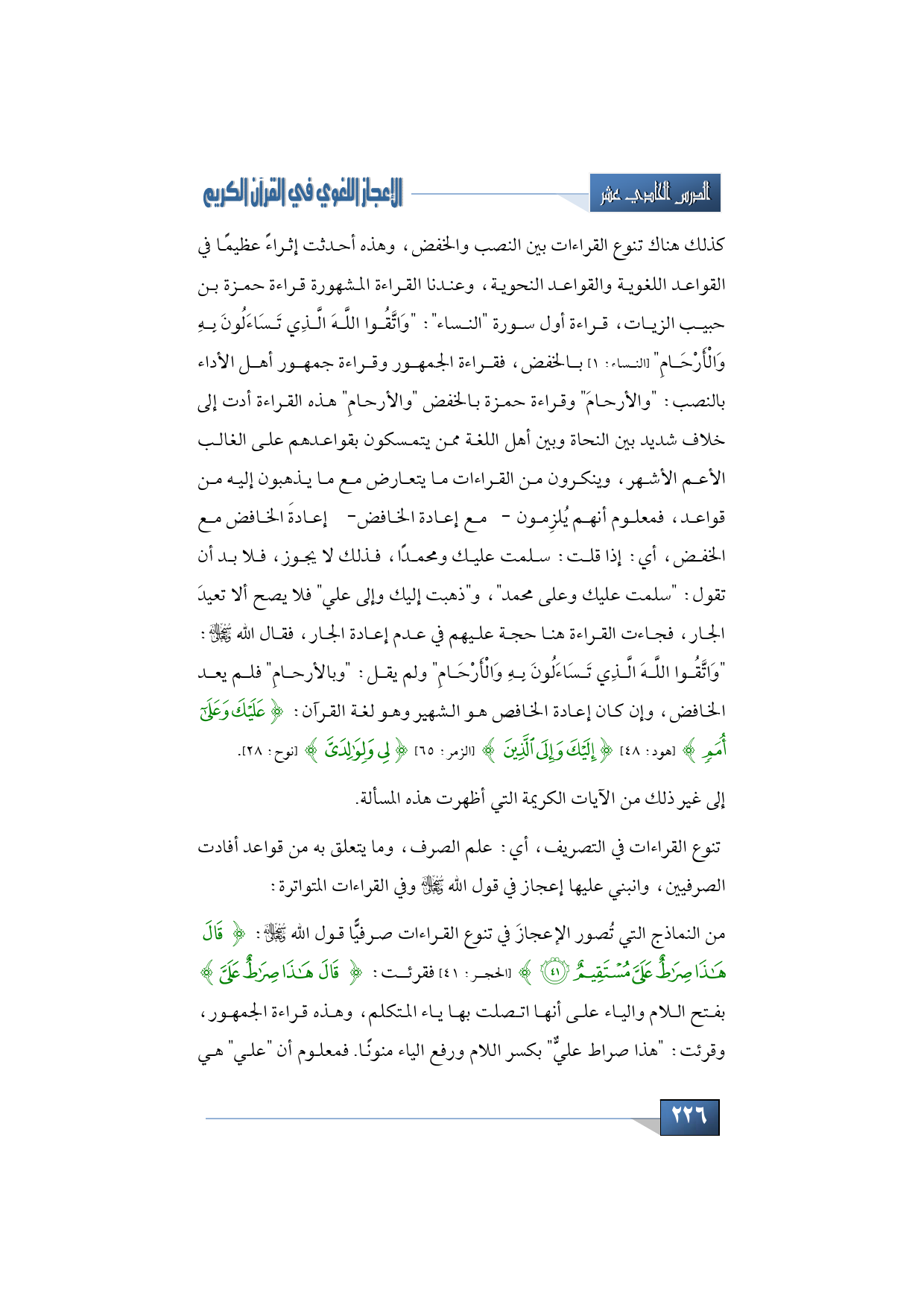 كذلك هناك تنوع القراءات بين النصب والخفض، وهذه أحدثت إثراءً عظيمًا في القواعد اللغوية والقواعد النحوية، وعندنا القراءة المشهورة قراءة حمزة بن حبيب الزيات، قراءة أول سورة النساء: "وَاتَّقُوا اللَّهَ الَّذِي تَسَاءَلُونَ بِهِ وَالْأَرْحَامِ" (النساء: 1) بالخفض، فقراءة الجمهور وقراءة جمهور أهل الأداء بالنصب: "والأرحامَ" وقراءة حمزة بالخفض "والأرحامِ" هذه القراءة أدت إلى خلاف شديد بين النحاة وبين أهل اللغة ممن يتمسكون بقواعدهم على الغالب الأعم الأشهر، وينكرون من القراءات ما يتعارض مع ما يذهبون إليه من قواعد، فمعلوم أنهم يُلزِمون -مع إعادة الخافض- إعادةَ الخافض مع الخفض، أي: إذا قلت: سلمت عليك ومحمدًا، فذلك لا يجوز، فلا بد أن تقول: سلمت عليك وعلى محمد، وذهبت إليك وإلى علي، فلا يصح ألا تعيدَ الجار، فجاءت القراءة هنا حجة عليهم في عدم إعادة الجار، فقال الله -سبحانه وتعالى-: "وَاتَّقُوا اللَّهَ الَّذِي تَسَاءَلُونَ بِهِ وَالْأَرْحَامِ" ولم يقل: "وبالأرحامِ" فلم يعد الخافض، وإن كان إعادة الخافص هو الشهير وهو لغة القرآن: {عَلَيْكَ وَعَلَى أُمَمٍ} (هود: 48) {إِلَيْكَ وَإِلَى الَّذِينَ} (الزمر: 65) {لِي وَلِوَالِدَيَّ} (نوح: 28).