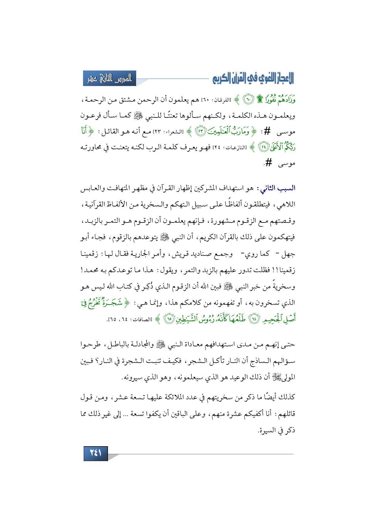 الغرض الثاني -أو السبب الثاني- هو استهداف المشركين إظهار القرآن في مظهر المتهافت والعابس اللاهي، فيتطلقون ألفاظًا على سبيل التهكم والسخرية من الألفاظ القرآنية، وقصتهم مع الزقوم مشهورة، فإنهم يعلمون أن الزقوم هو التمر بالزبد، فيتهكمون على ذلك بالقرآن الكريم، أن النبي -صلى الله عليه وسلم- يتوعدهم بالزقوم، فجاء أبو جهل -كما روي- وجمع صناديد قريش، وأمر الجارية فقال لها: زقمينا زقمينا!! فظلت تدور عليهم بالزبد والتمر، ويقول: هذا ما توعدكم به محمد! وسخريةً من خبر النبي -صلى الله عليه وسلم- فبين الله أن الزقوم الذي ذُكِر في كتاب الله ليس هو الذي تسخرون به، أو تفهمونه من كلامكم هذا، وإنما هي: {شَجَرَةٌ تَخْرُجُ فِي أَصْلِ الْجَحِيمِ * طَلْعُهَا كَأَنَّهُ رُءُوسُ الشَّيَاطِينِ} (الصافات: 64، 65).