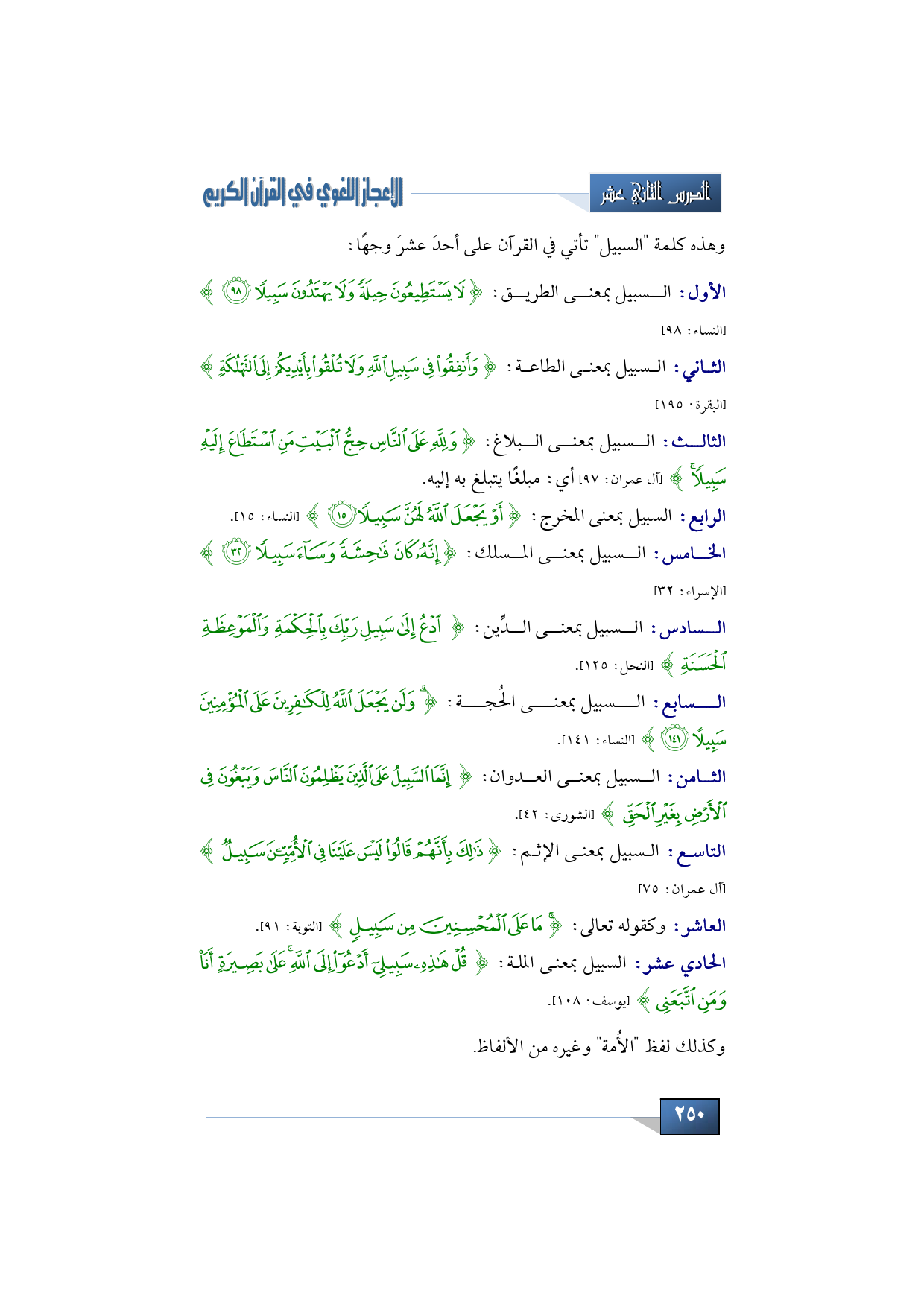 وهذه كلمة "السبيل" تأتي في القرآن على أحد عشرة وجهًا، السبيل بمعنى الطريق: {لَا يَسْتَطِيعُونَ حِيلَةً وَلَا يَهْتَدُونَ سَبِيلًا} (النساء: 98) السبيل بمعنى الطاعة: {وَأَنْفِقُوا فِي سَبِيلِ اللَّهِ وَلَا تُلْقُوا بِأَيْدِيكُمْ إِلَى التَّهْلُكَةِ} (البقرة: 195) السبيل بمعنى البلاغ: {وَلِلَّهِ عَلَى النَّاسِ حِجُّ الْبَيْتِ مَنِ اسْتَطَاعَ إِلَيْهِ سَبِيلًا} (آل عمران: 97) أي: مبلغًا يتبلغ به إليه. السبيل بمعنى المخرج: {أَوْ يَجْعَلَ اللَّهُ لَهُنَّ سَبِيلًا} (النساء: 15) السبيل بمعنى المسلك: {إِنَّهُ كَانَ فَاحِشَةً وَسَاءَ سَبِيلًا} (الإسراء: 32) السبيل بمعنى الدِّين: {ادْعُ إِلَى سَبِيلِ رَبِّكَ بِالْحِكْمَةِ وَالْمَوْعِظَةِ الْحَسَنَةِ} (النحل: 125) السبيل بمعنى الحُجة: {وَلَنْ يَجْعَلَ اللَّهُ لِلْكَافِرِينَ عَلَى الْمُؤْمِنِينَ سَبِيلًا} (النساء: 141) السبيل بمعنى العدوان: {إِنَّمَا السَّبِيلُ عَلَى الَّذِينَ يَظْلِمُونَ النَّاسَ وَيَبْغُونَ فِي الْأَرْضِ بِغَيْرِ الْحَقِّ} (الشورى: 42) السبيل بمعنى الإثم: {ذَلِكَ بِأَنَّهُمْ قَالُوا لَيْسَ عَلَيْنَا فِي الْأُمِّيِّينَ سَبِيلٌ} (آل عمران: 75) وكقوله تعالى: {مَا عَلَى الْمُحْسِنِينَ مِنْ سَبِيلٍ} (التوبة: 91) السبيل بمعنى الملة: {قُلْ هَذِهِ سَبِيلِي أَدْعُو إِلَى اللَّهِ عَلَى بَصِيرَةٍ أَنَا وَمَنِ اتَّبَعَنِي}.
