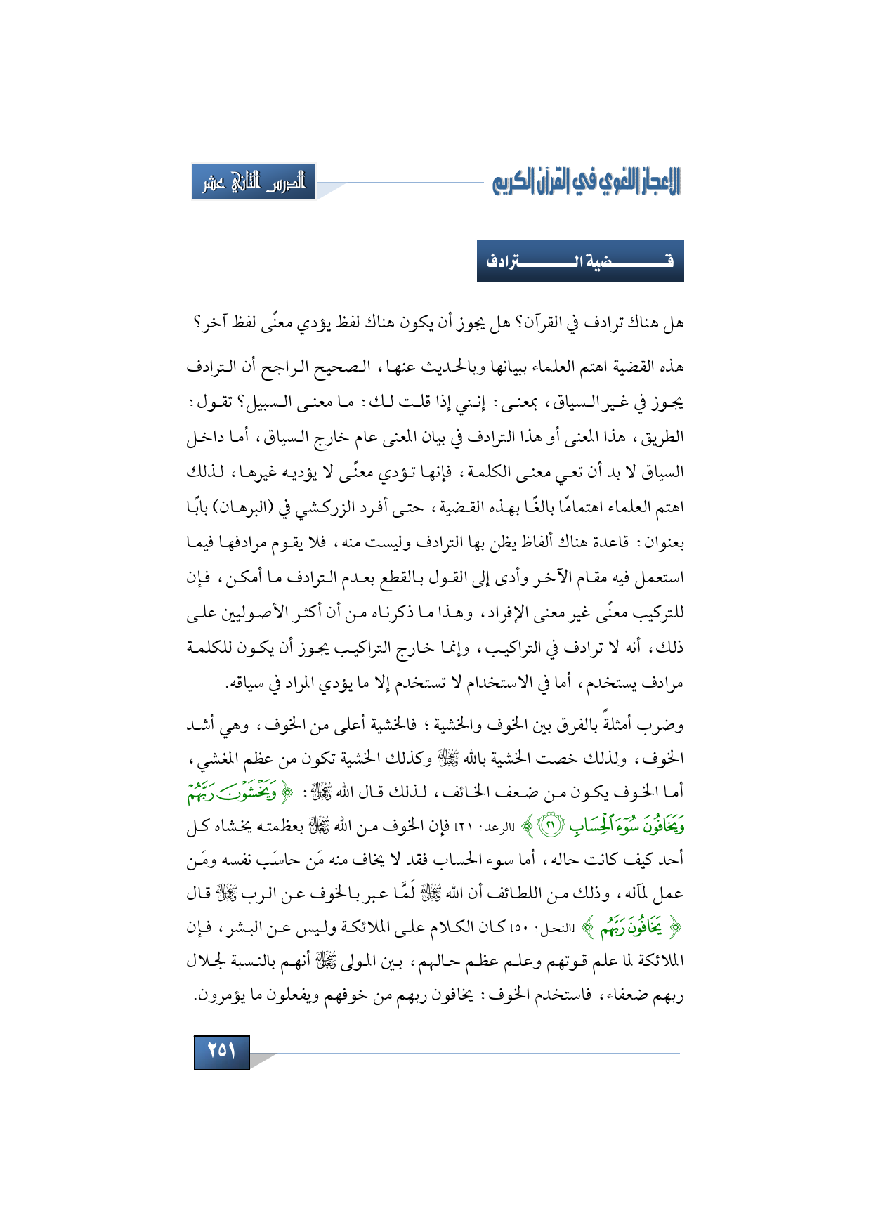وضرب أمثلةً بالفرق بين الخوف والخشية؛ فالخشية أعلى من الخوف، وهي أشد الخوف، ولذلك خصت الخشية بالله -سبحانه وتعالى- وكذلك الخشية تكون من عظم المغشي، أما الخوف يكون من ضعف الخائف، لذلك قال الله -سبحانه وتعالى-: {وَيَخْشَوْنَ رَبَّهُمْ وَيَخَافُونَ سُوءَ الْحِسَابِ} (الرعد: 21) فإن الخوف من الله -سبحانه وتعالى- بعظمته يخشاه كل أحد كيف كانت حاله، أما سوء الحساب فقد لا يخاف منه مَن حاسَب نفسه ومَن عمل لمآله، وذلك من اللطائف أن الله -سبحانه وتعالى- لَمَّا عبر بالخوف عن الرب -سبحانه وتعالى- قال {يَخَافُونَ رَبَّهُمْ} (النحل: 50) كان الكلام على الملائكة وليس عن البشر، فإن الملائكة لما علم قوتهم وعلم عظم حالهم، بين المولى -سبحانه وتعالى- أنهم بالنسبة لجلال ربهم ضعفاء، فاستخدم الخوف: يخافون ربهم من خوفهم ويفعلون ما يؤمرون.