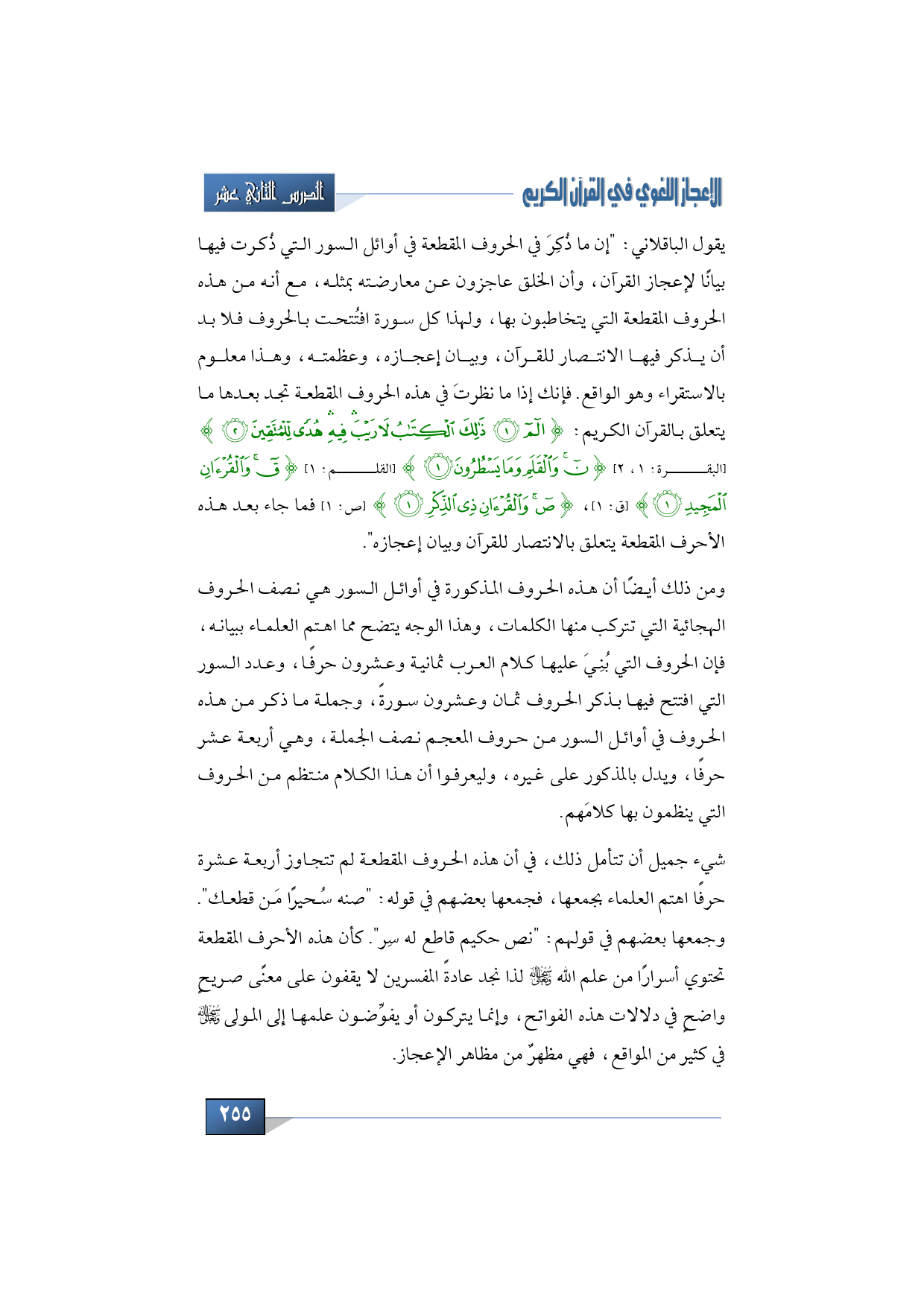 يقول الباقلاني: إن ما ذُكِرَ في الحروف المقطعة في أوائل السور التي ذُكرت فيها بيانًا لإعجاز القرآن، وأن الخلق عاجزون عن معارضته بمثله، مع أنه من هذه الحروف المقطعة التي يتخاطبون بها، ولهذا كل سورة افتُتحت بالحروف فلا بد أن يذكر فيها الانتصار للقرآن، وبيان إعجازه، وعظمته، وهذا معلوم بالاستقراء وهو الواقع. فإنك إذا ما نظرتَ في هذه الحروف المقطعة تجد بعدها ما يتعلق بالقرآن الكريم: {الم * ذَلِكَ الْكِتَابُ لَا رَيْبَ فِيهِ هُدًى لِلْمُتَّقِينَ} (البقرة: 1، 2) {ن وَالْقَلَمِ وَمَا يَسْطُرُونَ} (القلم: 1) {ق وَالْقُرْآنِ الْمَجِيدِ} (ق: 1)، {ص وَالْقُرْآنِ ذِي الذِّكْرِ} (ص: 1) فما جاء بعد هذه الأحرف المقطعة يتعلق بالانتصار للقرآن وبيان إعجازه.