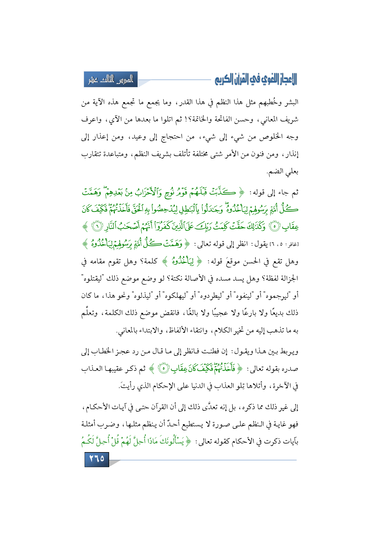 ثم جاء إلى قوله: {كَذَّبَتْ قَبْلَهُمْ قَوْمُ نُوحٍ وَالْأَحْزَابُ مِنْ بَعْدِهِمْ وَهَمَّتْ كُلُّ أُمَّةٍ بِرَسُولِهِمْ لِيَأْخُذُوهُ وَجَادَلُوا بِالْبَاطِلِ لِيُدْحِضُوا بِهِ الْحَقَّ فَأَخَذْتُهُمْ فَكَيْفَ كَانَ عِقَابِ * وَكَذَلِكَ حَقَّتْ كَلِمَةُ رَبِّكَ عَلَى الَّذِينَ كَفَرُوا أَنَّهُمْ أَصْحَابُ النَّارِ} (غافر: 5، 6) يقول: انظر إلى قوله تعالى: {وَهَمَّتْ كُلُّ أُمَّةٍ بِرَسُولِهِمْ لِيَأْخُذُوهُ} وهل تقع في الحسن موقعَ قوله: {لِيَأْخُذُوهُ} كلمة؟ وهل تقوم مقامه في الجزالة لفظة؟ وهل يسد مسده في الأصالة نكتة؟ لو وضع موضع ذلك "ليقتلوه" أو "ليرجموه" أو "لينفوه" أو "ليطردوه" أو "ليهلكوه" أو "ليذلوه" ونحو هذا، ما كان ذلك بديعًا ولا بارعًا ولا عجيبًا ولا بالغًا، فانقض موضع ذلك الكلمة، وتعلَّم به ما تذهب إليه من تخير الكلام، وانتقاء الألفاظ، والابتداء بالمعاني.
