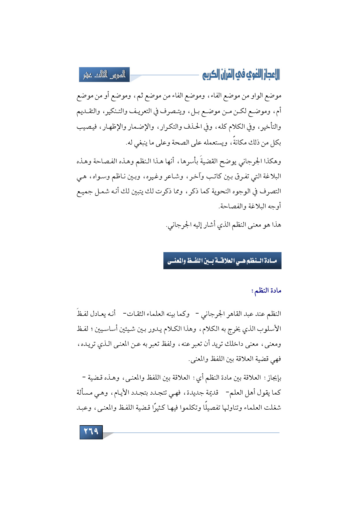 بإيجاز: العلاقة بين مادة النظم أي: العلاقة بين اللفظ والمعنى، وهذه قضية -كما يقول أهل العلم- قديمة جديدة، فهي تتجدد بتجدد الأيام، وهي مسألة شغلت العلماء وتناولها تفصيلًا وتكلموا فيها كثيرًا قضية اللفظ والمعنى، وعبد القاهر