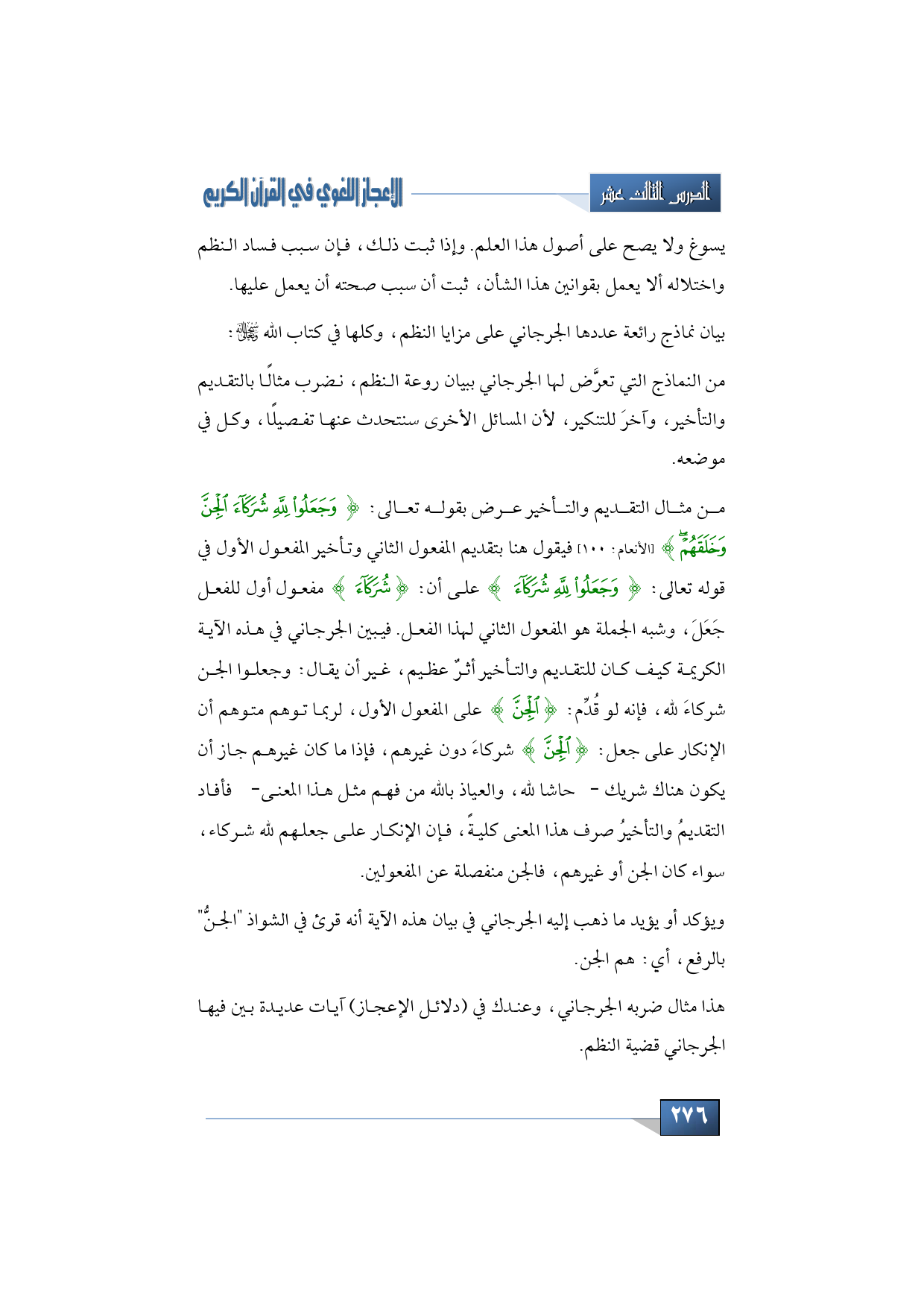 من مثال التقديم والتأخير عرض بقوله تعالى: {وَجَعَلُوا لِلَّهِ شُرَكَاءَ الْجِنَّ وَخَلَقَهُمْ} (الأنعام: 100) فيقول هنا بتقديم المفعول الثاني وتأخير المفعول الأول في قوله تعالى: {وَجَعَلُوا لِلَّهِ شُرَكَاءَ} على أن: {شُرَكَاءَ} مفعول أول للفعل جَعَلَ، وشبه الجملة هو المفعول الثاني لهذا الفعل. فيبين الجرجاني في هذه الآية الكريمة كيف كان للتقديم والتأخير أثرٌ عظيم، غير أن يقال: وجعلوا الجن شركاءَ لله، فإنه لو قُدِّم: {الْجِنَّ} على المفعول الأول، لربما توهم متوهم أن الإنكار على جعل: {الْجِنَّ} شركاءَ دون غيرهم، فإذا ما كان غيرهم جاز أن يكون هناك شريك -حاشا لله، والعياذ بالله من فهم مثل هذا المعنى- فأفاد التقديمُ والتأخيرُ صرف هذا المعنى كليةً، فإن الإنكار على جعلهم لله شركاء، سواء كان الجن أو غيرهم، فالجن منفصلة عن المفعولين.