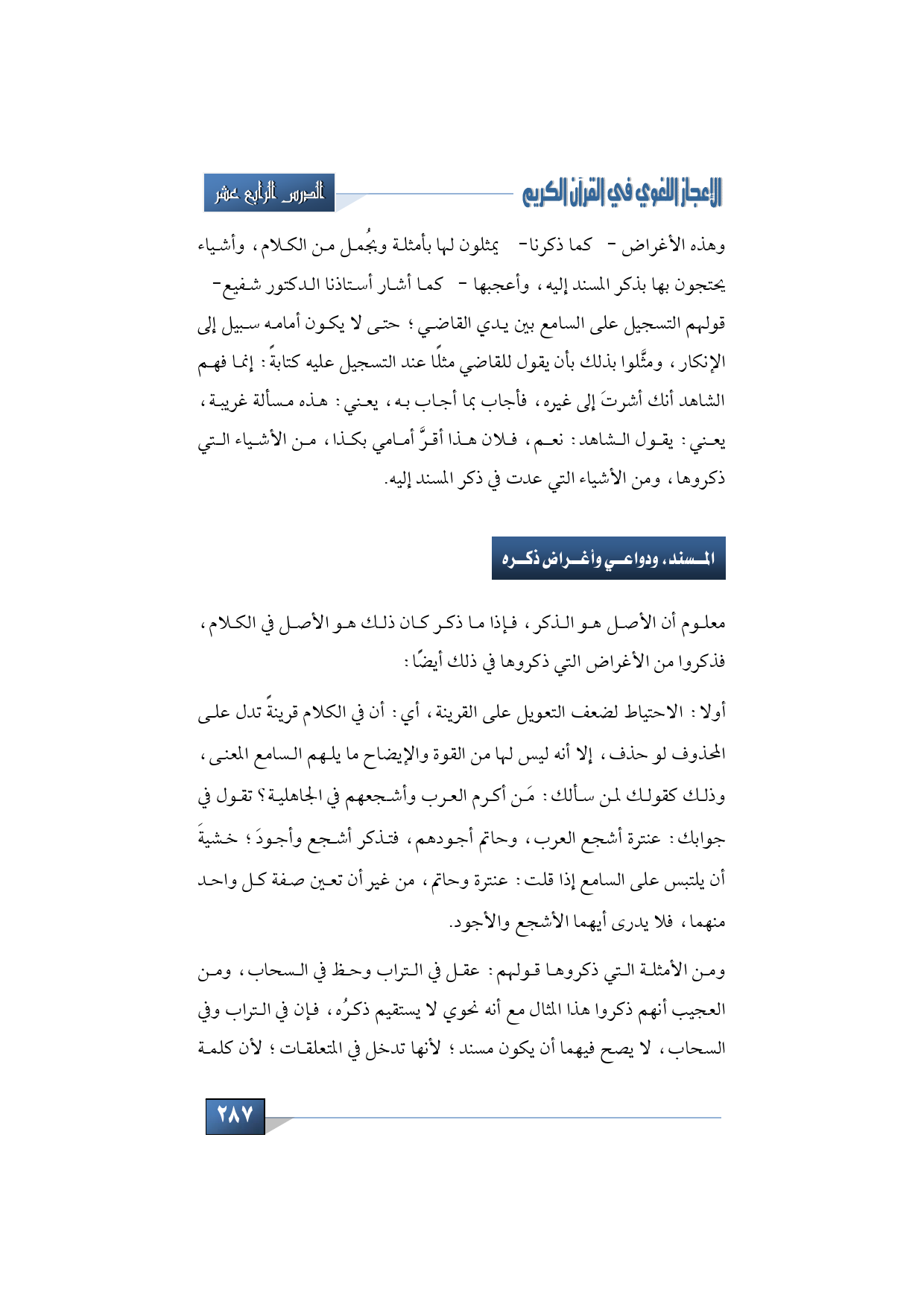 وهذه الأغراض -كما قلنا- يمثلون لها بأمثلة وبجُمل من الكلام، وأشياء يحتجون بها بذكر المسند إليه، وأعجبها -كما أشار أستاذنا الدكتور شفيع- قولهم التسجيل على السامع بين يدي القاضي؛ حتى لا يكون أمامه سبيل إلى الإنكار، ومثَّلوا بذلك بأن يقول للقاضي مثلًا عند التسجيل عليه كتابةً: إنما فهم الشاهد أنك أشرتَ إلى غيره، فأجاب بما أجاب به، يعني: هذه مسألة غريبة، يعني: يقول الشاهد: نعم، فلان هذا أقرَّ أمامي بكذا، من الأشياء التي ذكروها، ومن الأشياء التي عدت في ذكر المسند إليه.