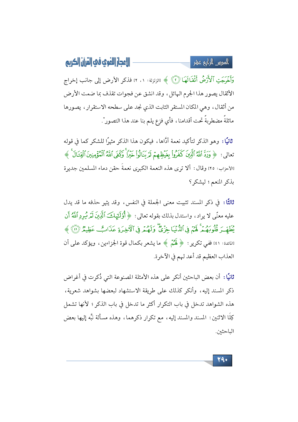 وَأَخْرَجَتِ الْأَرْضُ أَثْقَالَهَا} (الزلزلة: 1، 2) فذكر الأرض إلى جانب إخراج الأثقال يصور هذا الجرم الهائل وقد انشق عن فجوات تقذف بما ضمت الأرض من أثقال، وهي المكان المستقر الثابت الذي نجد على سطحه الاستقرار، يصورها مائلةً مضطربةً تحت أقدامنا، فأي فزع يلم بنا عند هذا التصور، وذَكر أيضًا غرضًا ثالثًا وهو الذكر لتأكيد نعمة أدَّاها، فيكون هذا الذكر مثيرًا للشكر كما في قوله تعالى: {وَرَدَّ اللَّهُ الَّذِينَ كَفَرُوا بِغَيْظِهِمْ لَمْ يَنَالُوا خَيْرًا وَكَفَى اللَّهُ الْمُؤْمِنِينَ الْقِتَالَ} (الأحزاب: 25) وقال: ألا ترى هذه النعمة الكبرى نعمةَ حقن دماء المسلمين جديرة بذكر المنعم؛ ليشكر؟