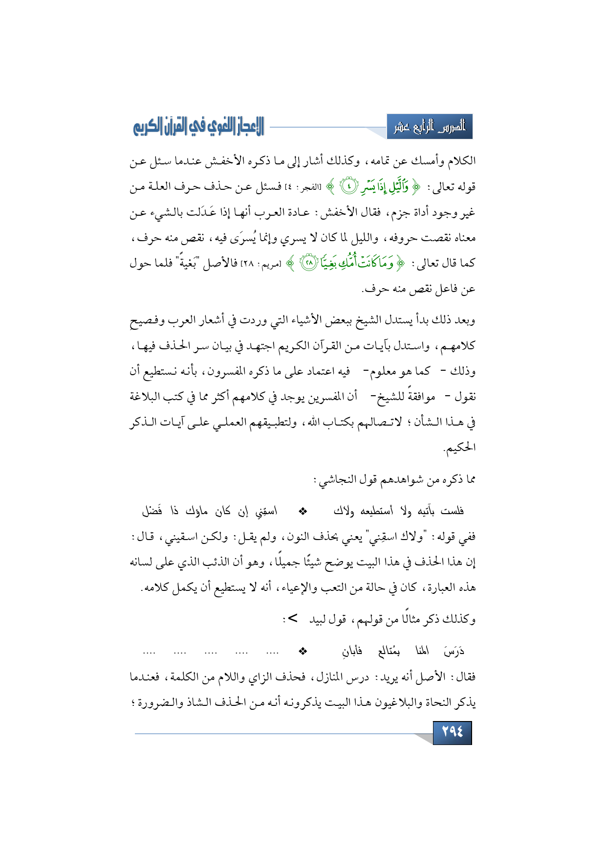 الكلام وأمسك عن تمامه، وكذلك أشار إلى ما ذكره الأخفش عندما سئل عن قوله تعالى: {وَاللَّيْلِ إِذَا يَسْرِي} (الفجر: 4) فسئل عن حذف حرف العلة من غير وجود أداة جزم، فقال الأخفش: عادة العرب أنها إذا عَدَلت بالشيء عن معناه نقصت حروفه، والليل لما كان لا يسري وإنما يُسرَى فيه، نقص منه حرف، كما قال تعالى: {وَمَا كَانَتْ أُمُّكِ بَغِيًّا} (مريم: 28) فالأصل "بَغيةً" فلما حول عن فاعل نقص منه حرف.
