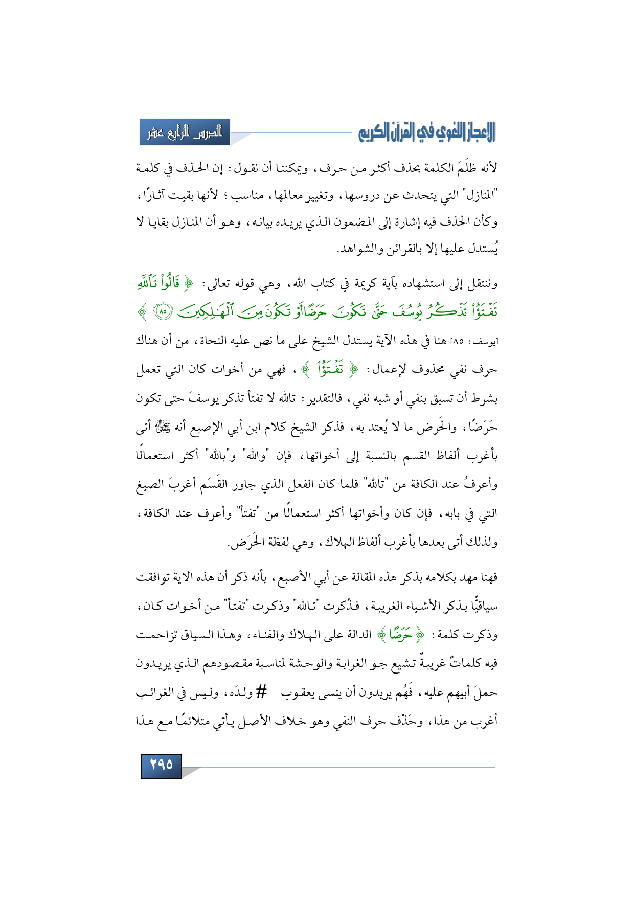 وننتقل إلى استشهاده بآية كريمة في كتاب الله، وهي قوله تعالى: {قَالُوا تَاللَّهِ تَفْتَأُ تَذْكُرُ يُوسُفَ حَتَّى تَكُونَ حَرَضًا أَوْ تَكُونَ مِنَ الْهَالِكِينَ} (يوسف: 85) هنا في هذه الآية يستدل الشيخ على ما نص عليه النحاة، من أن هناك حرف نفي محذوف لإعمال: {تَفْتَأُ}، فهي من أخوات كان التي تعمل بشرط أن تسبق بنفي أو شبه نفي، فالتقدير: تالله لا تفتأ تذكر يوسفَ حتى تكون حَرَضًا، والحَرض ما لا يُعتد به، فذكر الشيخ كلام ابن أبي الإصبع أنه -سبحانه وتعالى- أتى بأغرب ألفاظ القسم بالنسبة إلى أخواتها، فإن "والله" و"بالله" أكثر استعمالًا وأعرفُ عند الكافة من "تالله" فلما كان الفعل الذي جاور القَسَم أغربَ الصيغ التي في بابه، فإن كان وأخواتها أكثر استعمالًا من "تفتأ" وأعرف عند الكافة، ولذلك أتى بعدها بأغرب ألفاظ الهلاك، وهي لفظة الحَرَض.