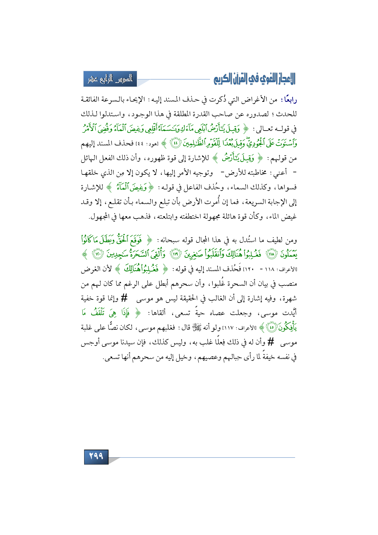 ومن لطيف ما استُدل به في هذا المجال قوله سبحانه: {فَوَقَعَ الْحَقُّ وَبَطَلَ مَا كَانُوا يَعْمَلُونَ * فَغُلِبُوا هُنَالِكَ وَانْقَلَبُوا صَاغِرِينَ * وَأُلْقِيَ السَّحَرَةُ سَاجِدِينَ} (الأعراف: 118 - 120) فَحُذف المسند إليه في قوله: {فَغُلِبُوا هُنَالِكَ} لأن الغرض منصب في بيان أن السحرة غُلبوا، وأن سحرهم أبطل على الرغم مما كان لهم من شهرة، وفيه إشارة إلى أن الغالب في الحقيقة ليس هو موسى -عليه السلام- وإنما قوة خفية أيَّدت موسى، وجعلت عصاه حيةً تسعى، ألقاها: {فَإِذَا هِيَ تَلْقَفُ مَا يَأْفِكُونَ} (الأعراف: 117) ولو أنه -سبحانه وتعالى- قال: فغلبهم موسى، لكان نصًّا على غلبة موسى -عليه السلام- وأن له في ذلك فِعلًا غلب به، وليس كذلك، فإن سيدنا موسى أوجس في نفسه خيفةً لما رأى حِبالهم وعصيهم، وخيل إليه من سحرهم أنها تسعى.