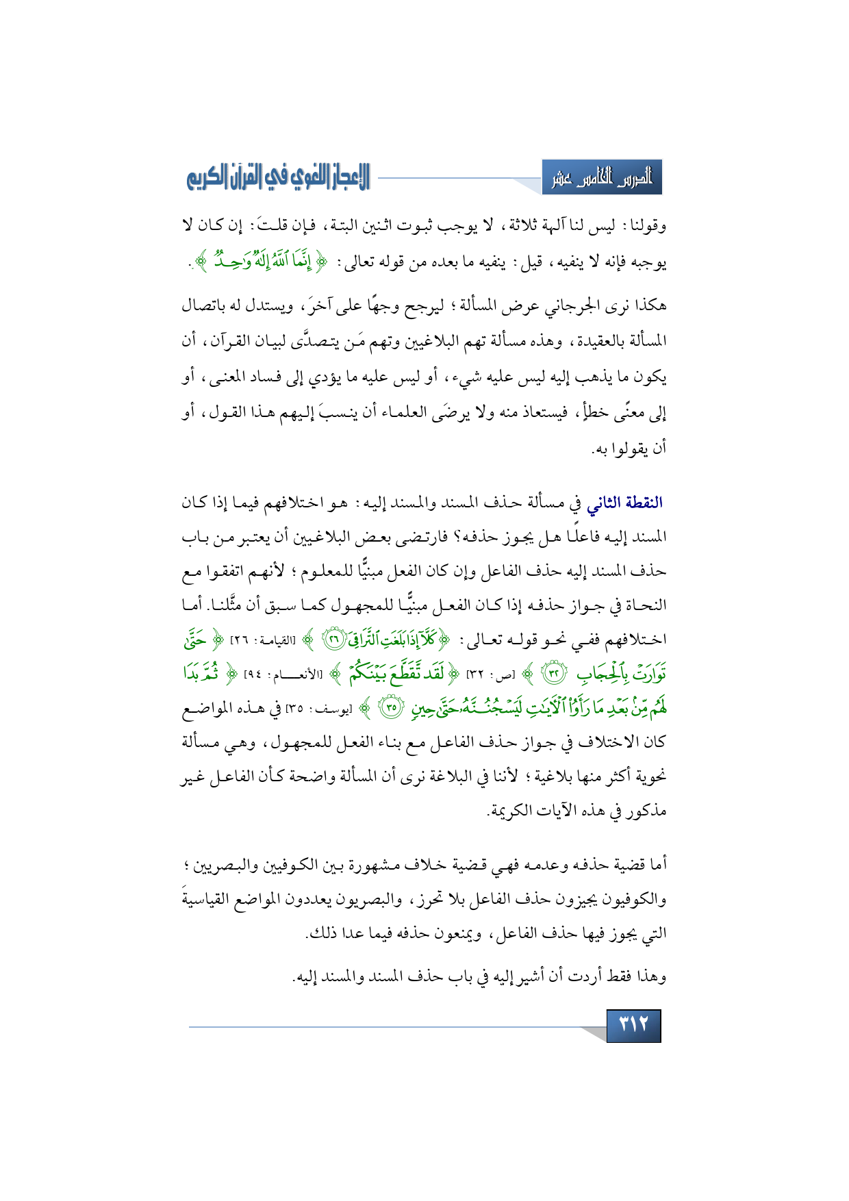 - التنبيه الثاني في مسألة حذف المسند والمسند إليه: هو اختلافهم فيما إذا كان المسند إليه فاعلًا هل يجوز حذفه؟ فارتضى بعض البلاغيين أن يعتبر من باب حذف المسند إليه حذف الفاعل وإن كان الفعل مبنيًّا للمعلوم؛ لأنهم اتفقوا مع النحاة في جواز حذفه إذا كان الفعل مبنيًّا للمجهول كما سبق أن مثَّلنا. أما اختلافهم ففي نحو قوله تعالى: {كَلَّا إِذَا بَلَغَتِ التَّرَاقِيَ} (القيامة: 26) {حَتَّى تَوَارَتْ بِالْحِجَابِ} (ص: 32) {لَقَدْ تَقَطَّعَ بَيْنَكُمْ} (الأنعام: 94) {ثُمَّ بَدَا لَهُمْ مِنْ بَعْدِ مَا رَأَوُا الْآيَاتِ لَيَسْجُنُنَّهُ حَتَّى حِينٍ} (يوسف: 35) في هذه المواضع كان الاختلاف في جواز حذف الفاعل مع بناء الفعل للمجهول، وهي مسألة نحوية أكثر منها بلاغية؛ لأننا في البلاغة نرى أن المسألة واضحة كأن الفاعل غير مذكور في هذه الآيات الكريمة.