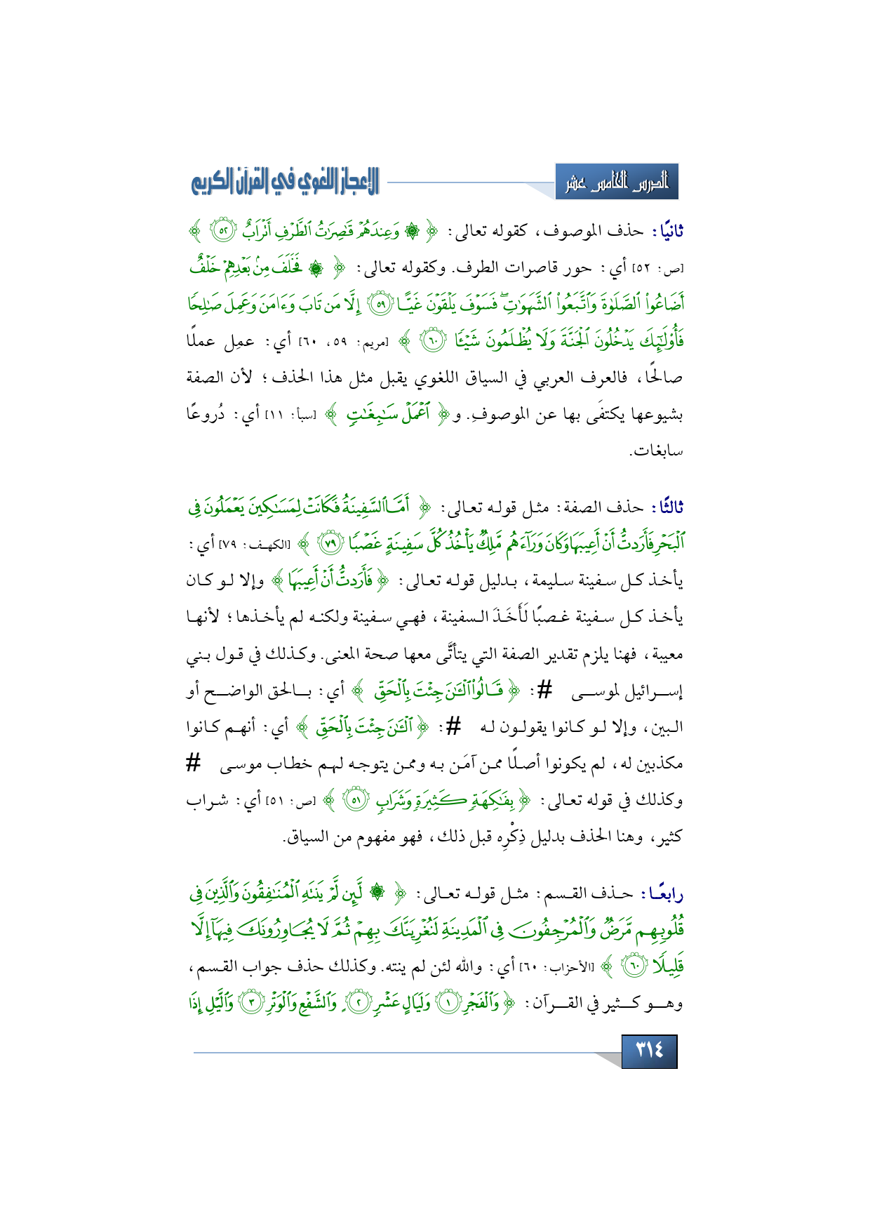 حذف الصفة: مثل قوله تعالى: {أَمَّا السَّفِينَةُ فَكَانَتْ لِمَسَاكِينَ يَعْمَلُونَ فِي الْبَحْرِ فَأَرَدْتُ أَنْ أَعِيبَهَا وَكَانَ وَرَاءَهُمْ مَلِكٌ يَأْخُذُ كُلَّ سَفِينَةٍ غَصْبًا} (الكهف: 79) أي: يأخذ كل سفينة سليمة، بدليل قوله تعالى: {فَأَرَدْتُ أَنْ أَعِيبَهَا} وإلا لو كان يأخذ كل سفينة غصبًا لَأَخَذَ السفينة، فهي سفينة ولكنه لم يأخذها؛ لأنها معيبة، فهنا يلزم تقدير الصفة التي يتأتَّى معها صحة المعنى. وكذلك في قول بني إسرائيل لموسى -عليه السلام-: {قَالُوا الْآنَ جِئْتَ بِالْحَقِّ} أي: بالحق الواضح أو البين، وإلا لو كانوا يقولون له -عليه السلام-: {الْآنَ جِئْتَ بِالْحَقِّ} أي: أنهم كانوا مكذبين له، لم يكونوا أصلًا ممن آمَن به وممن يتوجه لهم خطاب موسى -عليه السلام- وكذلك في قوله تعالى: {بِفَاكِهَةٍ كَثِيرَةٍ وَشَرَابٍ} (ص: 51) أي: شراب كثير، وهنا الحذف بدليل ذِكْرِه قبل ذلك، فهو مفهوم من السياق.