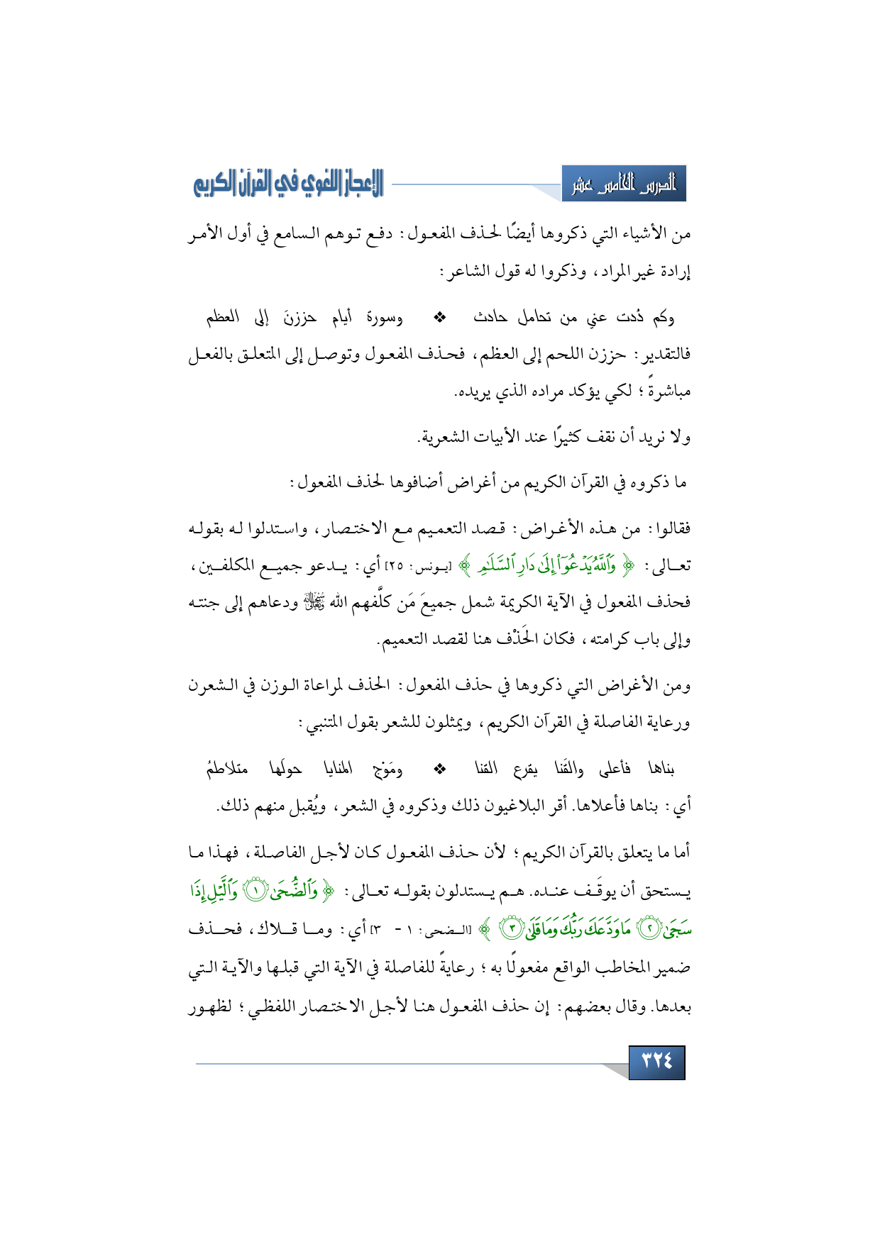 أما ما يتعلق بالقرآن الكريم؛ لأن حذف المفعول كان لأجل الفاصلة، فهذا ما يستحق أن يوقَف عنده. هم يستدلون بقوله تعالى: {وَالضُّحَى * وَاللَّيْلِ إِذَا سَجَى * مَا وَدَّعَكَ رَبُّكَ وَمَا قَلَى} (الضحى: 1 - 3) أي: وما قلاك، فحذف ضمير المخاطب الواقع مفعولًا به؛ رعايةً للفاصلة في الآية التي قبلها والآية التي بعدها. وقال بعضهم: إن حذف المفعول هنا لأجل الاختصار اللفظي؛ لظهور