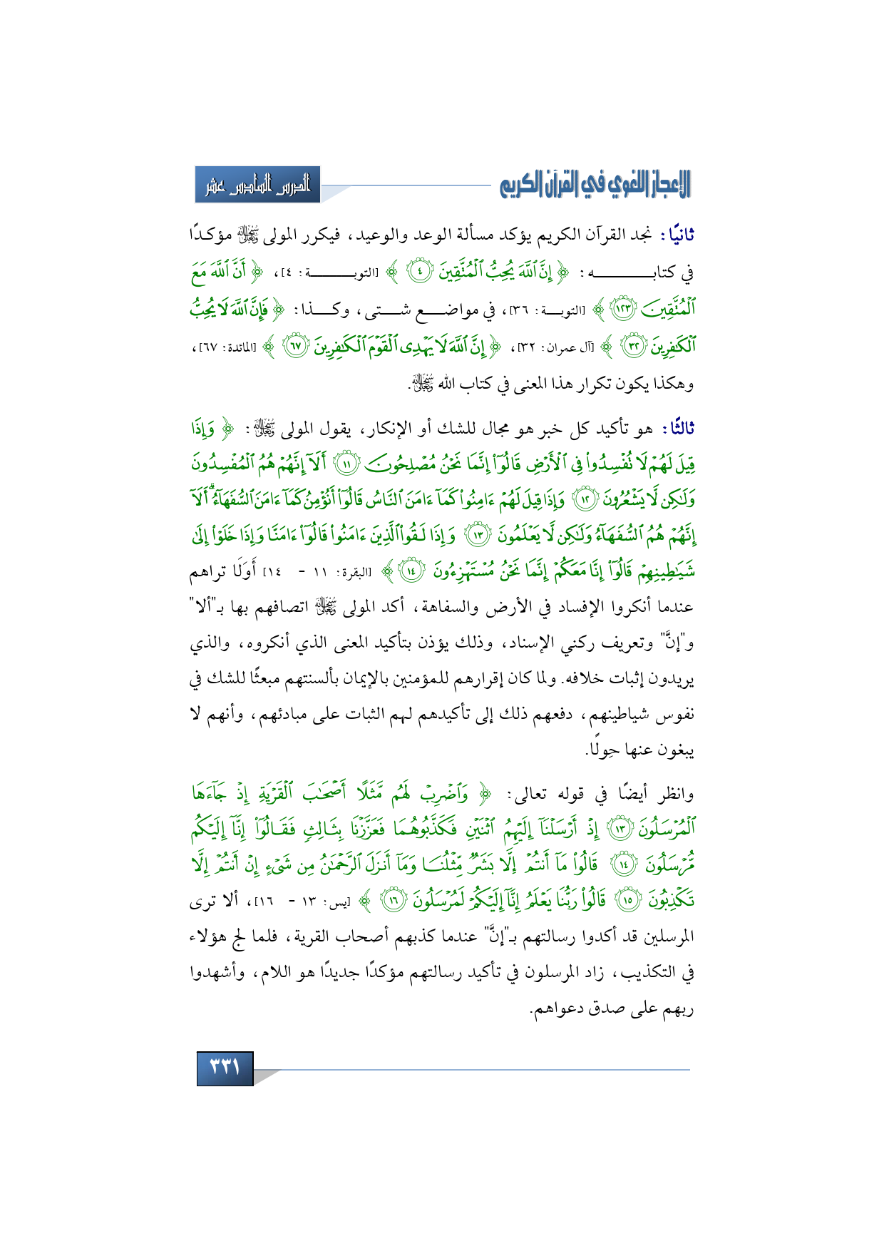 وانظر أيضًا في قوله تعالى: {وَاضْرِبْ لَهُمْ مَثَلًا أَصْحَابَ الْقَرْيَةِ إِذْ جَاءَهَا الْمُرْسَلُونَ * إِذْ أَرْسَلْنَا إِلَيْهِمُ اثْنَيْنِ فَكَذَّبُوهُمَا فَعَزَّزْنَا بِثَالِثٍ فَقَالُوا إِنَّا إِلَيْكُمْ مُرْسَلُونَ * قَالُوا مَا أَنْتُمْ إِلَّا بَشَرٌ مِثْلُنَا وَمَا أَنْزَلَ الرَّحْمَنُ مِنْ شَيْءٍ إِنْ أَنْتُمْ إِلَّا تَكْذِبُونَ * قَالُوا رَبُّنَا يَعْلَمُ إِنَّا إِلَيْكُمْ لَمُرْسَلُونَ} (يس: 13 - 16)، ألا ترى المرسلين قد أكدوا رسالتهم بـ"إنَّ" عندما كذبهم أصحاب القرية، فلما لج هؤلاء في التكذيب، زاد المرسلون في تأكيد رسالتهم مؤكدًا جديدًا هو اللام، وأشهدوا ربهم على صدق دعواهم.