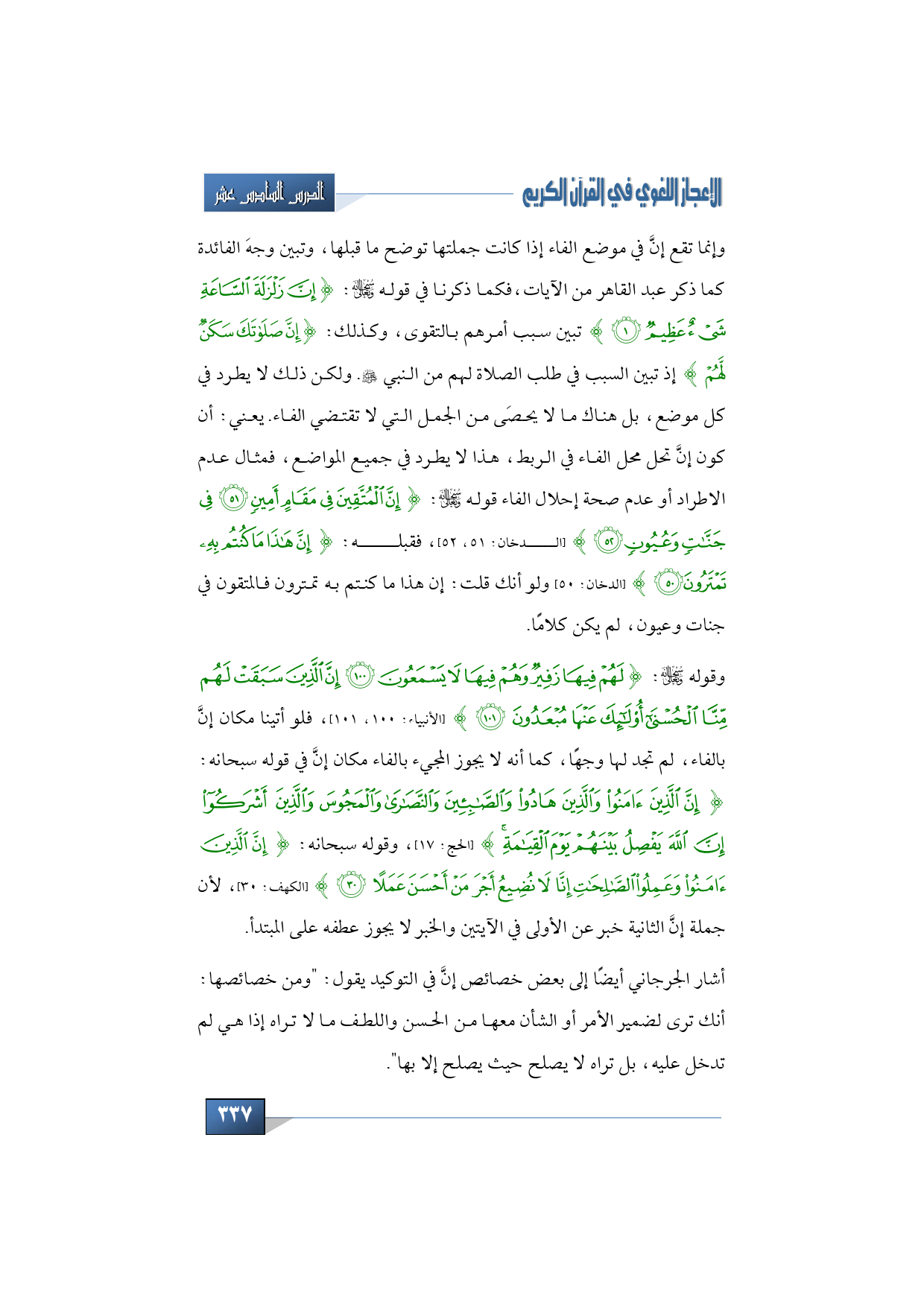 وقوله -سبحانه وتعالى: {لَهُمْ فِيهَا زَفِيرٌ وَهُمْ فِيهَا لَا يَسْمَعُونَ * إِنَّ الَّذِينَ سَبَقَتْ لَهُمْ مِنَّا الْحُسْنَى أُولَئِكَ عَنْهَا مُبْعَدُونَ} (الأنبياء: 100، 101)، فلو أتينا مكان إنَّ بالفاء، لم تجد لها وجهًا، كما أنه لا يجوز المجيء بالفاء مكان إنَّ في قوله سبحانه: {إِنَّ الَّذِينَ آمَنُوا وَالَّذِينَ هَادُوا وَالصَّابِئِينَ وَالنَّصَارَى وَالْمَجُوسَ وَالَّذِينَ أَشْرَكُوا إِنَّ اللَّهَ يَفْصِلُ بَيْنَهُمْ يَوْمَ الْقِيَامَةِ} (الحج: 17)، وقوله سبحانه: {إِنَّ الَّذِينَ آمَنُوا وَعَمِلُوا الصَّالِحَاتِ إِنَّا لَا نُضِيعُ أَجْرَ مَنْ أَحْسَنَ عَمَلًا} (الكهف: 30)، لأن جملة إنَّ الثانية خبر عن الأولى في الآيتين والخبر لا يجوز عطفه على المبتدأ.