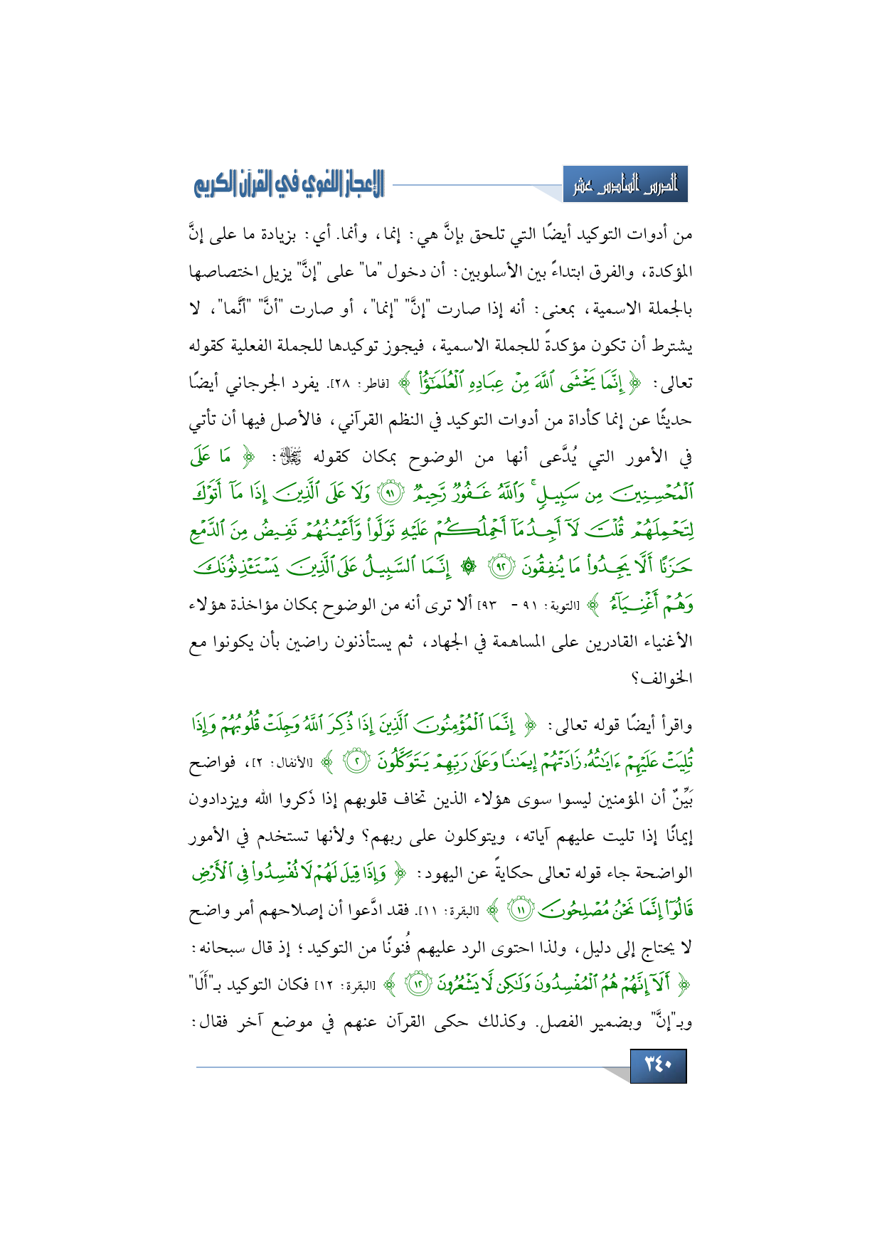 واقرأ أيضًا قوله تعالى: {إِنَّمَا الْمُؤْمِنُونَ الَّذِينَ إِذَا ذُكِرَ اللَّهُ وَجِلَتْ قُلُوبُهُمْ وَإِذَا تُلِيَتْ عَلَيْهِمْ آيَاتُهُ زَادَتْهُمْ إِيمَانًا وَعَلَى رَبِّهِمْ يَتَوَكَّلُونَ} (الأنفال: 2)، فواضح بَيِّنٌ أن المؤمنين ليسوا سوى هؤلاء الذين تخاف قلوبهم إذا ذَكروا الله ويزدادون إيمانًا إذا تليت عليهم آياته، ويتوكلون على ربهم؟ ولأنها تستخدم في الأمور الواضحة جاء قوله تعالى حكايةً عن اليهود: {وَإِذَا قِيلَ لَهُمْ لَا تُفْسِدُوا فِي الْأَرْضِ قَالُوا إِنَّمَا نَحْنُ مُصْلِحُونَ} (البقرة: 11). فقد ادَّعوا أن إصلاحهم أمر واضح لا يحتاج إلى دليل، ولذا احتوى الرد عليهم فُنونًا من التوكيد، إذ قال سبحانه: {أَلَا إِنَّهُمْ هُمُ الْمُفْسِدُونَ وَلَكِنْ لَا يَشْعُرُونَ} (البقرة: 12) فكان التوكيد بـ"أَلَا" وبـ"إنَّ" وبضمير الفصل. وكذلك حكى القرآن عنهم في موضع آخر فقال: