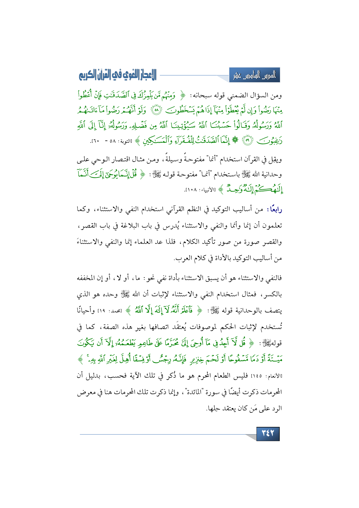ثالثًا: من أساليب التوكيد في النظم القرآني استخدام النفي والاستثناء، وكما تعلمون أن إنما وأنما والنفي والاستثناء يُدرس في باب البلاغة في باب القصر، والقصر صورة من صور تأكيد الكلام، فلذا عد العلماء إنما والنفي والاستثناءَ من أساليب التوكيد بالأداة في كلام العرب. فالنفي والاستثناء هو أن يسبق الاستثناء بأداة نفي نحو: ما، أو لا، أو إن المخففه بالكسر، فمثال استخدام النفي والاستثناء لإثبات أن الله -سبحانه وتعالى- وحده هو الذي يتصف بالوحدانية قوله -سبحانه وتعالى: {فَاعْلَمْ أَنَّهُ لَا إِلَهَ إِلَّا اللَّهُ} (محمد: 19) وأحيانًا تُستخدم لإثبات الحكم لموصوفات يُعتقَد اتصافها بغير هذه الصفة، كما في قوله -سبحانه وتعالى: {قُلْ لَا أَجِدُ فِي مَا أُوحِيَ إِلَيَّ مُحَرَّمًا عَلَى طَاعِمٍ يَطْعَمُهُ إِلَّا أَنْ يَكُونَ مَيْتَةً أَوْ دَمًا مَسْفُوحًا أَوْ لَحْمَ خِنْزِيرٍ فَإِنَّهُ رِجْسٌ أَوْ فِسْقًا أُهِلَّ لِغَيْرِ اللَّهِ بِهِ} (الأنعام: 145) فليس الطعام المحرم هو ما ذُكر في تلك الآية فحسب، بدليل أن المحرمات ذكرت أيضًا في سورة المائدة، وإنما ذكرت تلك المحرمات هنا في معرض الرد على مَن كان يعتقد حِلها.