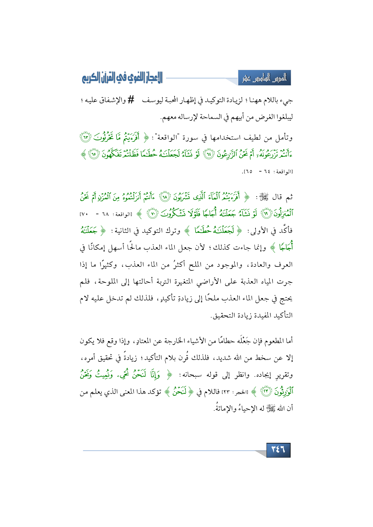 وانظر أيضًا من لطيف استخدامها في سورة الواقعة: {أَفَرَأَيْتُمْ مَا تَحْرُثُونَ * أَأَنْتُمْ تَزْرَعُونَهُ أَمْ نَحْنُ الزَّارِعُونَ * لَوْ نَشَاءُ لَجَعَلْنَاهُ حُطَامًا فَظَلْتُمْ تَفَكَّهُونَ} (الواقعة: 64 - 65) ثم قال -سبحانه وتعالى: {أَفَرَأَيْتُمُ الْمَاءَ الَّذِي تَشْرَبُونَ * أَأَنْتُمْ أَنْزَلْتُمُوهُ مِنَ الْمُزْنِ أَمْ نَحْنُ الْمُنْزِلُونَ * لَوْ نَشَاءُ جَعَلْنَاهُ أُجَاجًا فَلَوْلَا تَشْكُرُونَ} (الواقعة: 68 - 70) فأكَّد في الأولى: {لَجَعَلْنَاهُ حُطَامًا} وترك التوكيد في الثانية: {جَعَلْنَاهُ أُجَاجًا} وإنما جاءت كذلك؛ لأن جعل الماء العذب مالحًا أسهل إمكانًا في العرف والعادة، والموجود من الملح أكثرُ من الماء العذب، وكثيرًا ما إذا جرت المياه العذبة على الأراضي المتغيرة التربة أحالتها إلى الملوحة، فلم يحتج في جعل الماء العذب ملحًا إلى زيادةِ تأكيدٍ، فلذلك لم تدخل عليه لام التأكيد المفيدة زيادة التحقيق. أما المطعوم فإن جَعْلَه حطامًا من الأشياء الخارجة عن المعتادٍ، وإذا وقع فلا يكون إلا عن سخط من الله شديد، فلذلك قُرن بلام التأكيد؛ زيادةً في تحقيق أمره، وتقريرِ إيجاده. وانظر إلى قوله سبحانه: {وَإِنَّا لَنَحْنُ نُحْيِي وَنُمِيتُ وَنَحْنُ الْوَارِثُونَ} (الحجر: 23) فاللام في {لَنَحْنُ} تؤكد هذا المعنى الذي يعلم من أن الله -سبحانه وتعالى- له الإحياءُ والإماتةُ.