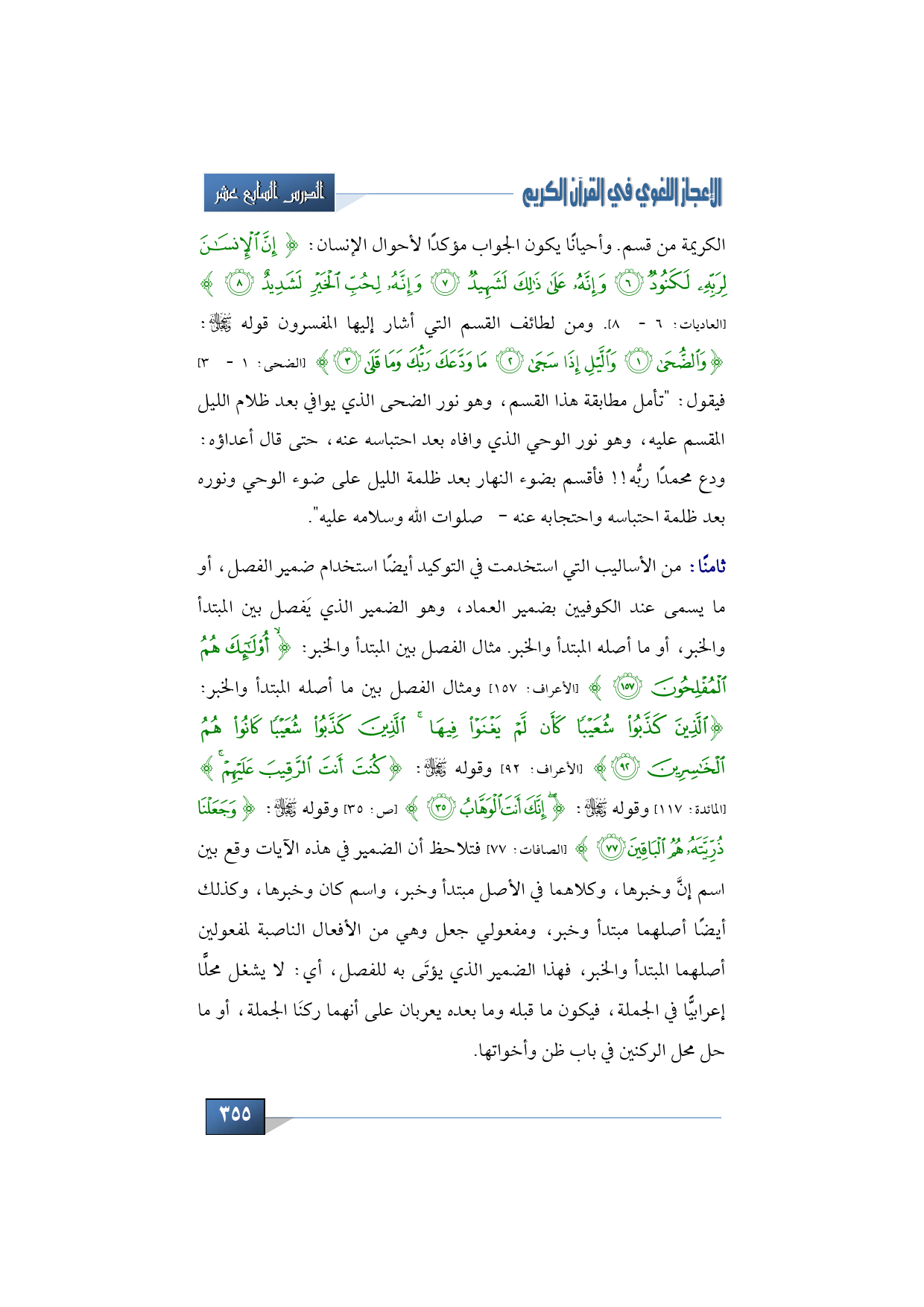 الكريمة من قسم. وأحيانًا يكون الجواب مؤكدًا لأحوال الإنسان: {إِنَّ الْإِنْسَانَ لِرَبِّهِ لَكَنُودٌ * وَإِنَّهُ عَلَى ذَلِكَ لَشَهِيدٌ * وَإِنَّهُ لِحُبِّ الْخَيْرِ لَشَدِيدٌ} (العاديات: 6 - 8). ومن لطائف القسم التي أشار إليها المفسرون قوله -سبحانه وتعالى: {وَالضُّحَى * وَاللَّيْلِ إِذَا سَجَى * مَا وَدَّعَكَ رَبُّكَ وَمَا قَلَى} (الضحى: 1 - 3) فيقول: تأمل مطابقة هذا القسم، وهو نور الضحى الذي يوافي بعد ظلام الليل المقسم عليه، وهو نور الوحي الذي وافاه بعد احتباسه عنه، حتى قال أعداؤه: ودع محمدًا ربُّه!! فأقسم بضوء النهار بعد ظلمة الليل على ضوء الوحي ونوره بعد ظلمة احتباسه واحتجابه عنه -صلوات الله وسلامه عليه.