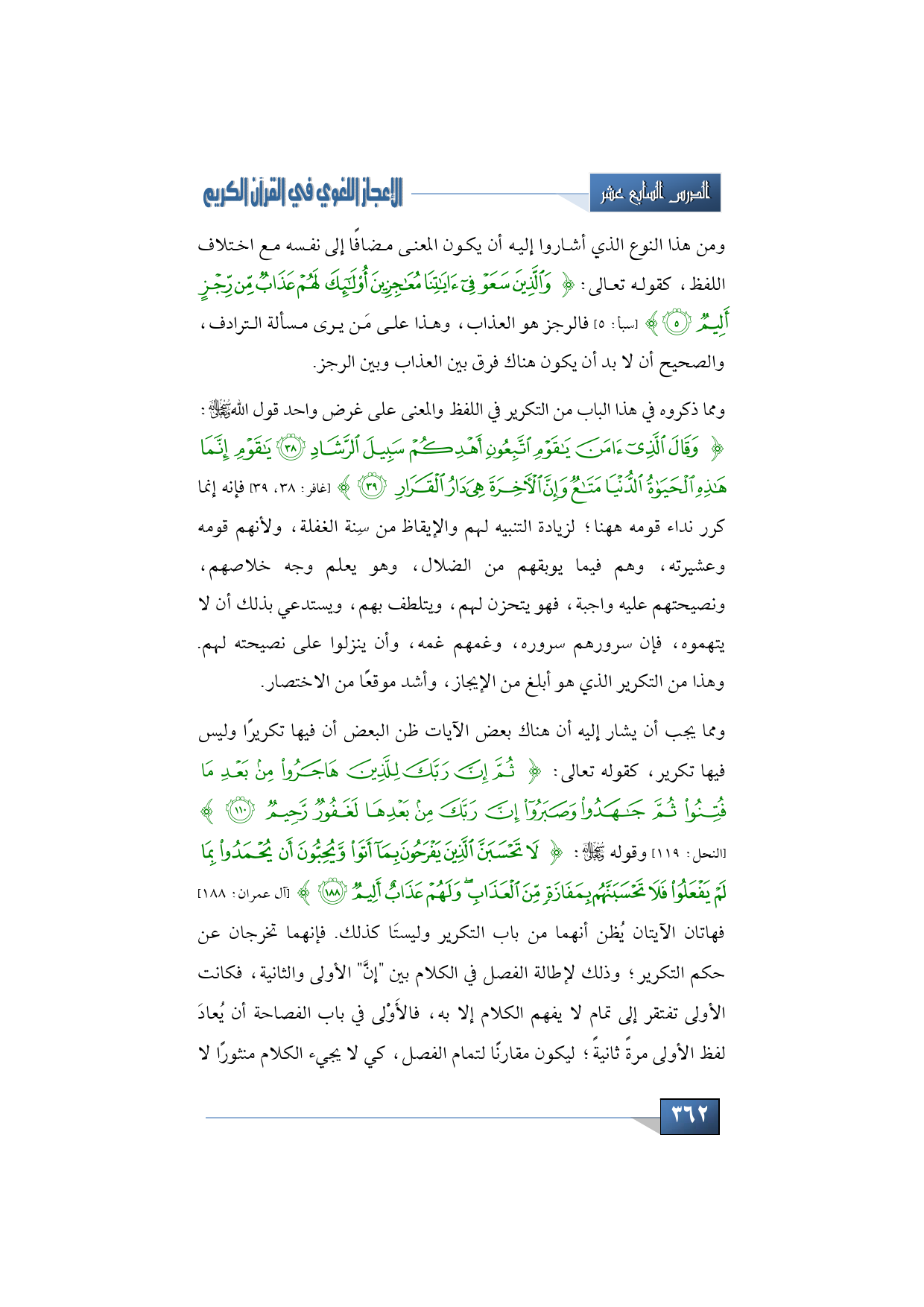 ومما يجب أن يشار إليه أن هناك بعض الآيات ظن البعض أن فيها تكريرًا وليس فيها تكرير، كقوله تعالى: {ثُمَّ إِنَّ رَبَّكَ لِلَّذِينَ عَمِلُوا السُّوءَ بِجَهَالَةٍ ثُمَّ تَابُوا مِنْ بَعْدِ ذَلِكَ وَأَصْلَحُوا إِنَّ رَبَّكَ مِنْ بَعْدِهَا لَغَفُورٌ رَحِيمٌ} (النحل: 119) وقوله -سبحانه وتعالى: {لَا تَحْسَبَنَّ الَّذِينَ يَفْرَحُونَ بِمَا أَتَوْا وَيُحِبُّونَ أَنْ يُحْمَدُوا بِمَا لَمْ يَفْعَلُوا فَلَا تَحْسَبَنَّهُمْ بِمَفَازَةٍ مِنَ الْعَذَابِ} (آل عمران: 188) فهاتان الآيتان يُظن أنهما من باب التكرير وليستَا كذلك. فإنهما تخرجان عن حكم التكرير؛ وذلك لإطالة الفصل في الكلام بين "إنَّ" الأولى والثانية، فكانت الأولى تفتقر إلى تمام لا يفهم الكلام إلا به، فالأَوْلى في باب الفصاحة أن يُعادَ لفظ الأولى مرةً ثانيةً؛ ليكون مقارنًا لتمام الفصل، كي لا يجيء الكلام منثورًا لا سيما