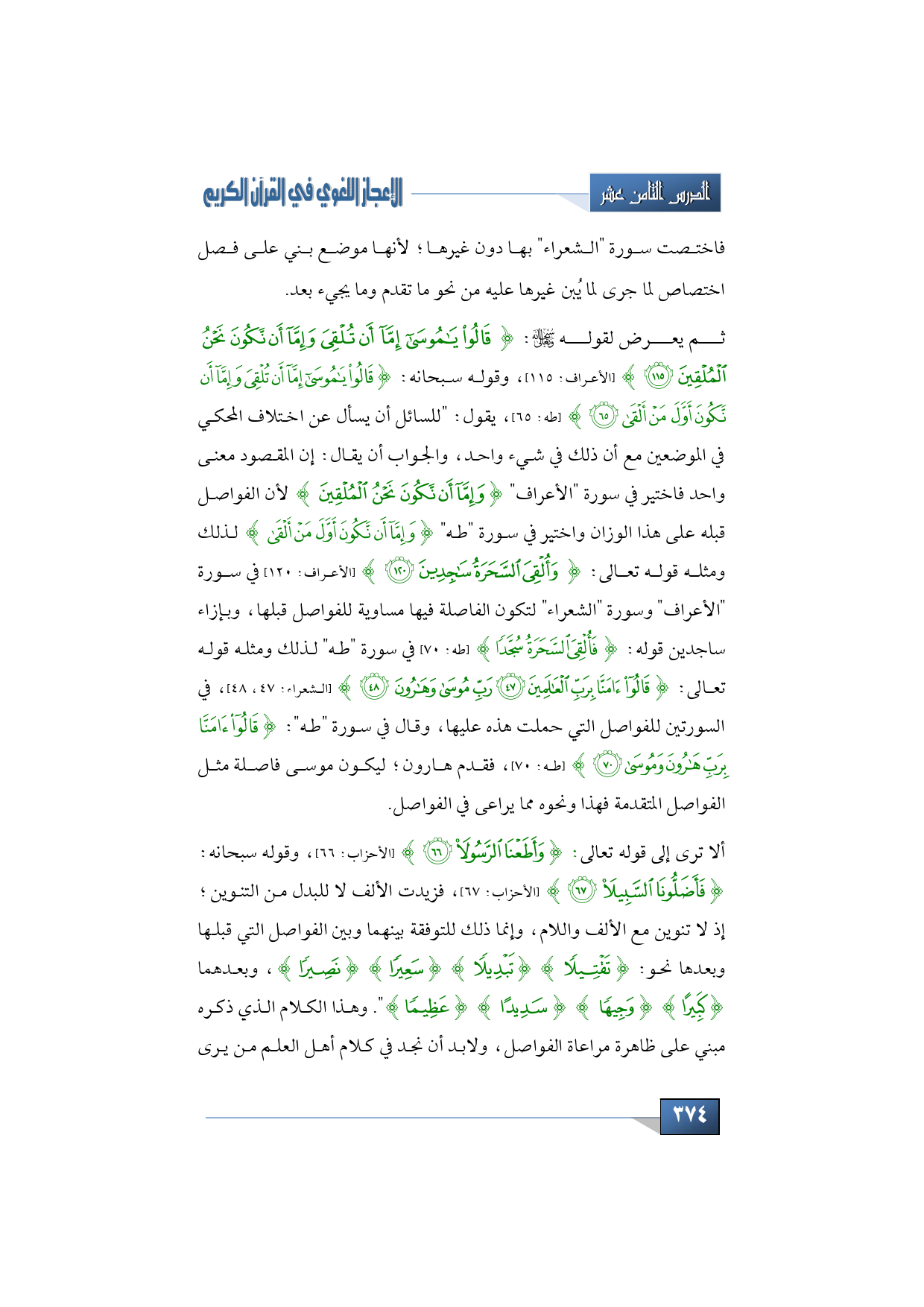 ثم يعرض لقوله سبحانه وتعالى: {قَالُوا يَا مُوسَى إِمَّا أَنْ تُلْقِيَ وَإِمَّا أَنْ نَكُونَ نَحْنُ الْمُلْقِينَ} (الأعراف: 115)، وقوله سبحانه: {قَالُوا يَا مُوسَى إِمَّا أَنْ تُلْقِيَ وَإِمَّا أَنْ نَكُونَ أَوَّلَ مَنْ أَلْقَى} (طه: 65)، يقول: "للسائل أن يسأل عن اختلاف المحكي في الموضعين مع أن ذلك في شيء واحد، والجواب أن يقال: إن المقصود معنى واحد فاختير في سورة الأعراف {وَإِمَّا أَنْ نَكُونَ نَحْنُ الْمُلْقِينَ} لأن الفواصل قبله على هذا الوزان واختير في سورة طه {وَإِمَّا أَنْ نَكُونَ أَوَّلَ مَنْ أَلْقَى} لذلك ومثله قوله تعالى: {وَأُلْقِيَ السَّحَرَةُ سَاجِدِينَ} (الأعراف: 120) في سورة الأعراف وسورة الشعراء لتكون الفاصلة فيها مساوية للفواصل قبلها، وبإزاء ساجدين قوله: {فَأُلْقِيَ السَّحَرَةُ سُجَّدًا} (طه: 70) في سورة طه لذلك ومثله قوله تعالى: {قَالُوا آمَنَّا بِرَبِّ الْعَالَمِينَ * رَبِّ مُوسَى وَهَارُونَ} (الشعراء: 47، 48)، في السورتين للفواصل التي حملت هذه عليها، وقال في سورة طه: {قَالُوا آمَنَّا بِرَبِّ هَارُونَ وَمُوسَى} (طه: 70)، فقدم هارون؛ ليكون موسى فاصلة مثل الفواصل المتقدمة فهذا ونحوه مما يراعى في الفواصل.
