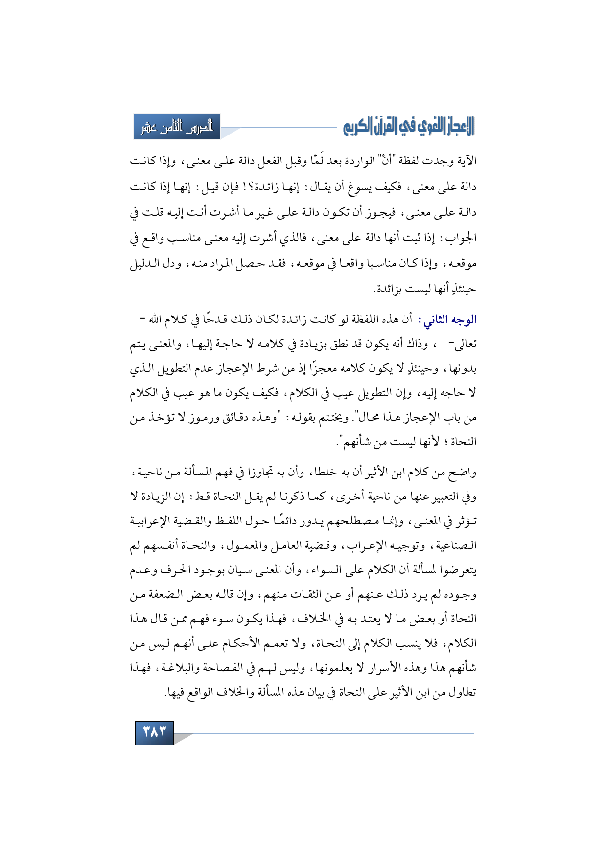 واضح من كلام ابن الأثير أن به خلطا، وأن به تجاوزا في فهم المسألة من ناحية، وفي التعبير عنها من ناحية أخرى، كما ذكرنا لم يقل النحاة قط: إن الزيادة لا تؤثر في المعنى، وإنما مصطلحهم يدور دائمًا حول اللفظ والقضية الإعرابية الصناعية، وتوجيه الإعراب، وقضية العامل والمعمول، والنحاة أنفسهم لم يتعرضوا لمسألة أن الكلام على السواء، وأن المعنى سيان بوجود الحرف وعدم وجوده لم يرد ذلك عنهم أو عن الثقات منهم، وإن قاله بعض الضعفة من النحاة أو بعض ما لا يعتد به في الخلاف، فهذا يكون سوء فهم ممن قال هذا الكلام، فلا ينسب الكلام إلى النحاة، ولا تعمم الأحكام على أنهم ليس من شأنهم هذا وهذه الأسرار لا يعلمونها، وليس لهم في الفصاحة والبلاغة، فهذا تطاول من ابن الأثير على النحاة في بيان هذه المسألة والخلاف الواقع فيها.
