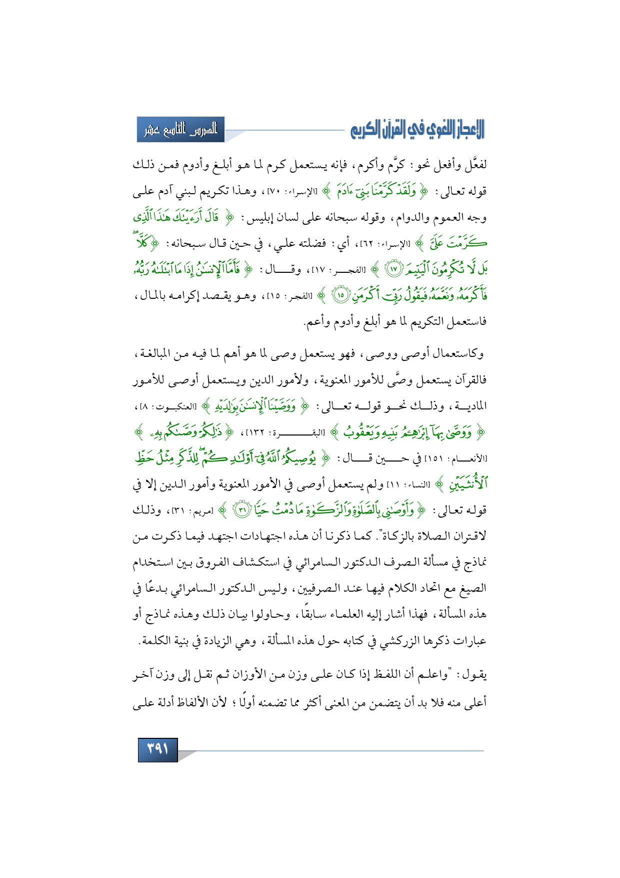 وكاستعمال أوصى ووصى، فهو يستعمل وصى لما هو أهم لما فيه من المبالغة، فالقرآن يستعمل وصَّى للأمور المعنوية، ولأمور الدين ويستعمل أوصى للأمور المادية، وذلك نحو قوله تعالى: {وَوَصَّيْنَا الْإِنْسَانَ بِوَالِدَيْهِ} (العنكبوت: 8)، {وَوَصَّى بِهَا إِبْرَاهِيمُ بَنِيهِ وَيَعْقُوبُ} (البقرة: 132)، {ذَلِكُمْ وَصَّاكُمْ بِهِ} (الأنعام: 151) في حين قال: {يُوصِيكُمُ اللَّهُ فِي أَوْلَادِكُمْ لِلذَّكَرِ مِثْلُ حَظِّ الْأُنْثَيَيْنِ} (النساء: 11) ولم يستعمل أوصى في الأمور المعنوية وأمور الدين إلا في قوله تعالى: {وَأَوْصَانِي بِالصَّلَاةِ وَالزَّكَاةِ مَا دُمْتُ حَيًّا} (مريم: 31)، وذلك لاقتران الصلاة بالزكاة". كما ذكرت أن هذه اجتهادات اجتهد فيما ذكرت من نماذج في مسألة الصرف الدكتور السامرائي في استكشاف الفروق بين استخدام الصيغ مع اتحاد الكلام فيها عند الصرفيين، وليس الدكتور السامرائي بدعًا في هذه المسألة، فهذا أشار إليه العلماء سابقًا، وحاولوا بيان ذلك وهذه نماذج أو عبارات ذكرها الزركشي في كتابه حول هذه المسألة، وهي الزيادة في بنية الكلمة.