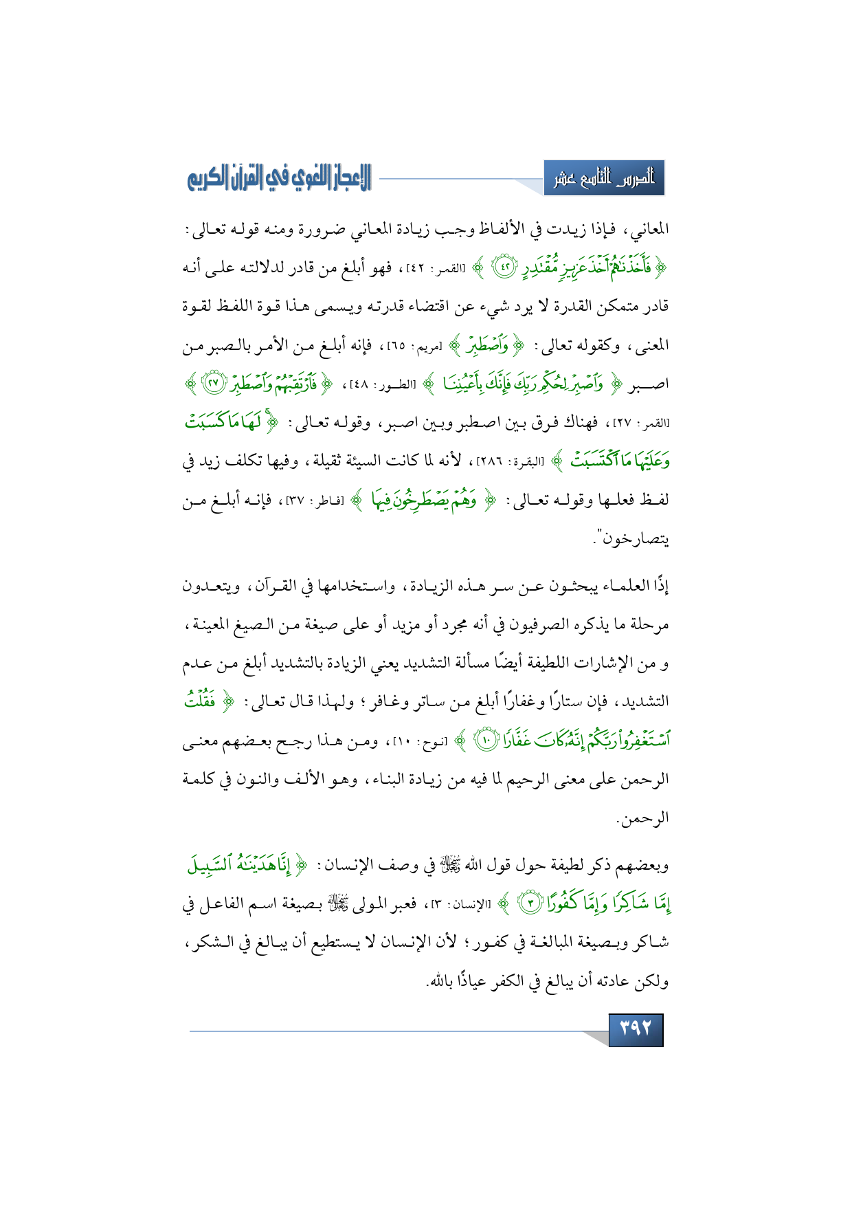 المعاني، فإذا زيدت في الألفاظ وجب زيادة المعاني ضرورة ومنه قوله تعالى: {فَأَخَذْنَاهُمْ أَخْذَ عَزِيزٍ مُقْتَدِرٍ} (القمر: 42)، فهو أبلغ من قادر لدلالته على أنه قادر متمكن القدرة لا يرد شيء عن اقتضاء قدرته ويسمى هذا قوة اللفظ لقوة المعنى، وكقوله تعالى: {وَاصْطَبِرْ} (مريم: 65)، فإنه أبلغ من الأمر بالصبر من اصبر {وَاصْبِرْ لِحُكْمِ رَبِّكَ فَإِنَّكَ بِأَعْيُنِنَا} (الطور: 48)، {فَارْتَقِبْهُمْ وَاصْطَبِرْ} (القمر: 27)، فهناك فرق بين اصطبر وبين اصبر، وقوله تعالى: {لَهَا مَا كَسَبَتْ وَعَلَيْهَا مَا اكْتَسَبَتْ} (البقرة: 286)، لأنه لما كانت السيئة ثقيلة، وفيها تكلف زيد في لفظ فعلها وقوله تعالى: {وَهُمْ يَصْطَرِخُونَ فِيهَا} (فاطر: 37)، فإنه أبلغ من يتصارخون".