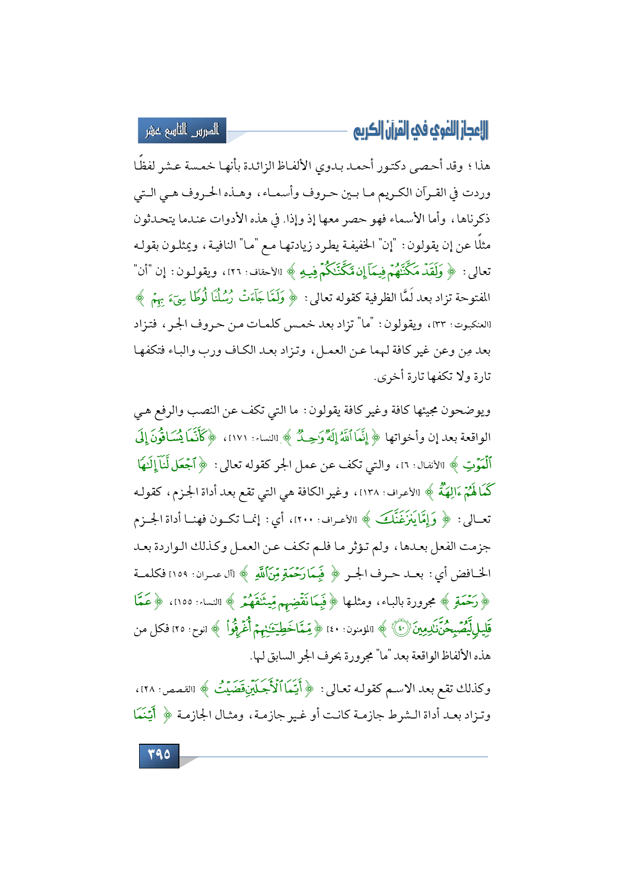 هذا وقد أحصى دكتور أحمد بدوي الألفاظ الزائدة بأنها خمسة عشر لفظًا وردت في القرآن الكريم ما بين حروف وأسماء، وهذه الحروف هي التي ذكرناها، وأما الأسماء فهو حصر معها إذ وإذا. في هذه الأدوات عندما يتحدثون مثلًا عن إن يقولون: "إن" الخفيفة يطرد زيادتها مع "ما" النافية، ويمثلون بقوله تعالى: {وَلَقَدْ مَكَّنَّاهُمْ فِيمَا إِنْ مَكَّنَّاكُمْ فِيهِ} (الأحقاف: 26)، ويقولون: إن "أن" المفتوحة تزاد بعد لَمَّا الظرفية كقوله تعالى: {وَلَمَّا أَنْ جَاءَتْ رُسُلُنَا لُوطًا سِيءَ بِهِمْ} (العنكبوت: 33)، ويقولون: "ما" تزاد بعد خمس كلمات من حروف الجر،، فتزاد بعد مِن وعن غير كافة لهما عن العمل، وتزاد بعد الكاف ورب والباء فتكفها تارة ولا تكفها تارة أخرى.