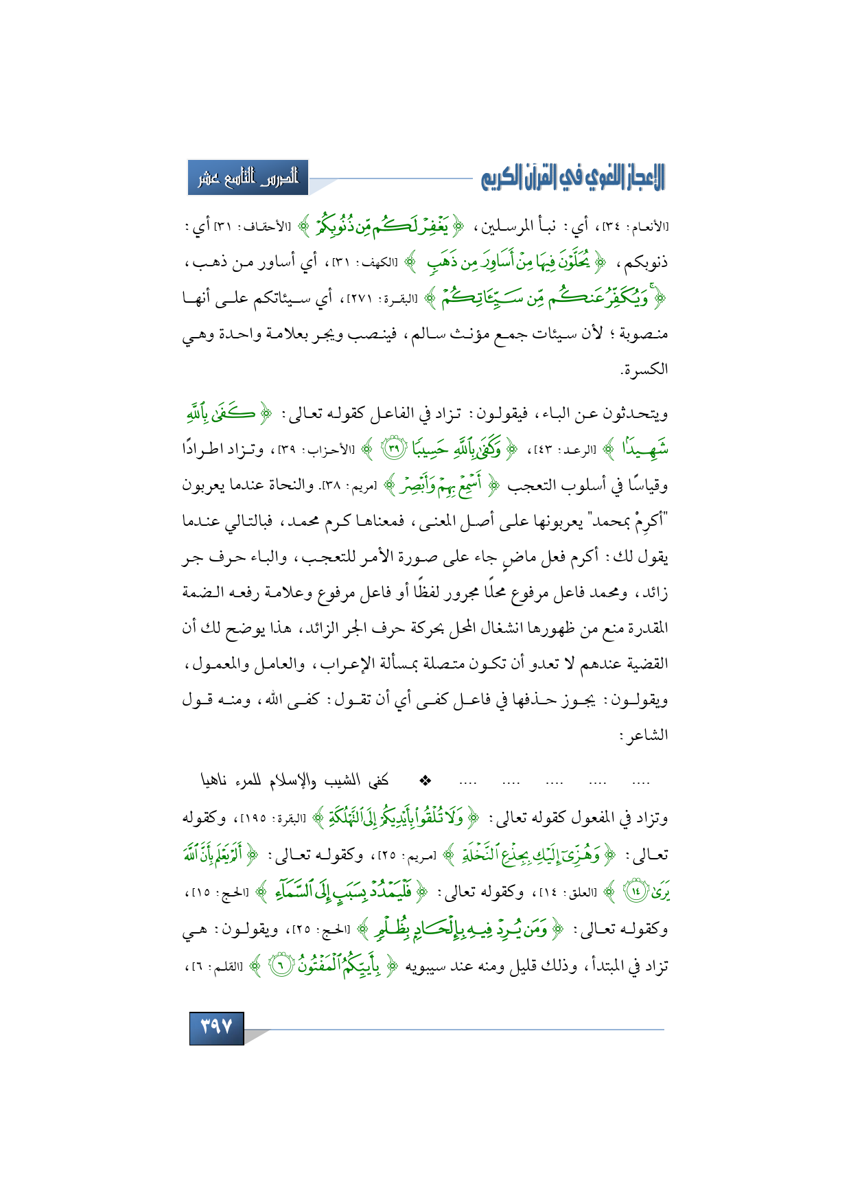 ويتحدثون عن الباء، فيقولون: تزاد في الفاعل كقوله تعالى: {كَفَى بِاللَّهِ شَهِيدًا} (الرعد: 43)، {وَكَفَى بِاللَّهِ حَسِيبًا} (الأحزاب: 39)، وتزاد اطرادًا وقياسًا في أسلوب التعجب {أَسْمِعْ بِهِمْ وَأَبْصِرْ} (مريم: 38). والنحاة عندما يعربون "أكرِمْ بمحمد" يعربونها على أصل المعنى، فمعناها كرم محمد، فبالتالي عندما يقول لك: أكرم فعل ماضٍ جاء على صورة الأمر للتعجب، والباء حرف جر زائد، ومحمد فاعل مرفوع محلًا مجرور لفظًا أو فاعل مرفوع وعلامة رفعه الضمة المقدرة منع من ظهورها انشغال المحل بحركة حرف الجر الزائد، هذا يوضح لك أن القضية عندهم لا تعدو أن تكون متصلة بمسألة الإعراب، والعامل والمعمول، ويقولون: يجوز حذفها في فاعل كفى أي أن تقول: كفى الله، ومنه قول الشاعر: