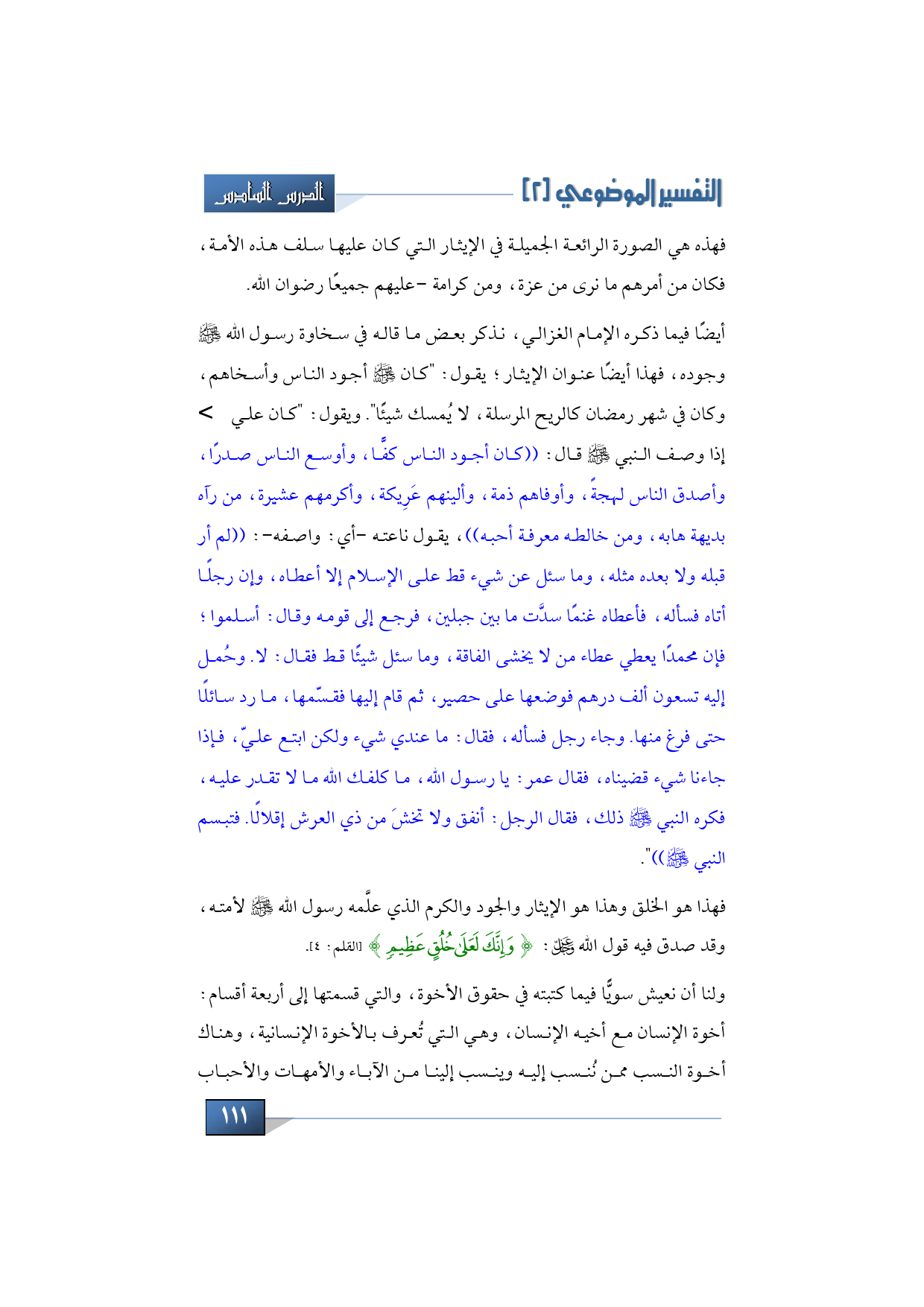 أيضًا فيما ذكره الإمام الغزالي نذكر بعض ما قاله في سخاوة رسول الله -صلى الله عليه وسلم- وجوده، فهذا أيضًا عنوان الإيثار يقول: كان -صلى الله عليه وسلم- أجود الناس وأسخاهم، وكان في شهر رمضان كالريح المرسلة، لا يُمسك شيئًا. ويقول: كان علي -رضي الله عنه- إذا وصف النبي -صلى الله عليه وسلم- قال: ((كان أجود الناس كفًّا، وأوسع الناس صدرًا، وأصدق الناس لهجةً، وأوفاهم ذمة، وألينهم عريكة، وأكرمهم عشيرة، من رآه بديهة هابه، ومن خالطه معرفة أحبه))، يقول ناعته -أي: واصفه-: ((لم أر قبله ولا بعده مثله، وما سئل عن شيء قط على الإسلام إلا أعطاه، وأن رجلًا أتاه فسأله فأعطاه غنمًا سدَّت ما بين جبلين، فرجع إلى قومه وقال: أسلموا فإن محمد يعطي عطاء من لا يخشى الفاقة، وما سئل شيئًا قط فقال: لا. وحُمل إليه تسعون ألف درهم فوضعها على حصير ثم قام إليها فقسمها ما رد سائلًا حتى فرغ منها، وجاء رجل فسأله فقال: ما عندي شيء ولكن ابتع عليّ، فإذا جاءنا شيء قضيناه فقال عمر يا رسول الله: ما كلفك الله ما لا تقدر عليه، فكره النبي -صلى الله عليه وسلم- ذلك، فقال الرجل: أنفق ولا تخشى من ذي العرش إقلالًا، فتبسم النبي -صلى الله عليه وسلم)).