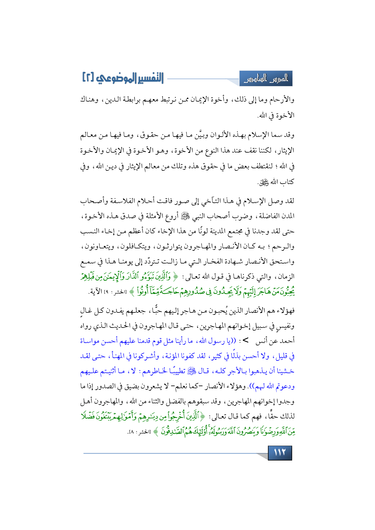 وقد سما الإسلام بهذه الألوان وبيَّن ما فيها من حقوق، وما فيها من معالم الإيثار، ولكننا نقف عند هذا النوع من الأخوة، وهو الأخوة في الإيمان والأخوة في الله لنقتطف بعض ما في حقوق هذه وتلك من معالم الإيثار في دين الله، وفي كتاب الله -عز وجل.