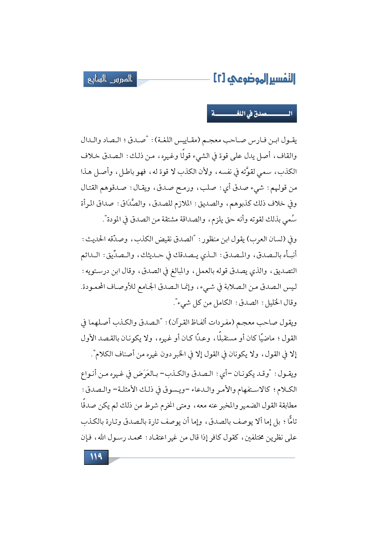 ما جاء في كتب اللغة في بيان معنى الصدق: وسوف أنتقي من هذه الكتب ما يختصّ بموضوعنا يقول صاحب معجم (مقاييس اللغة) الإمام ابن فارس: صدق الصاد والدار والقاف، أصل يدل على قوة في الشيء قولًا وغيره، من ذلك الصدق خلاف الكذب، سمي لقوَّته في نفسه، ولأن الكذب لا قوة له هو باطل، وأصل هذا من قولهم شيء صدق أي: صلب، ورمح صدق، ويقال: صدقوهم القتال، وفي خلاف ذلك كذبوهم، والصديق الملازم للصدق، والصداق: صداق المرأة سُمي بذلك لقوته، وأنه حق يلزم، والصداقة مشتقة من الصدق في المودة، وفي (لسان العرب) يقول ابن منظور: الصدق نقيض الكذب، وصدقه الحديث أنبأه بالصدق، والمصدق الذي يصدقك في حديثك، والصديق الدائم التصديق، والذي يصدق قوله بالعمل والمبالغ في الصدق، والصَّدْق الثبت اللقاء، وقال ابن درستويه: ليس الصدق من الصلابة في شيء، وإنما الصدق الجامع للأوصاف المحمودة.