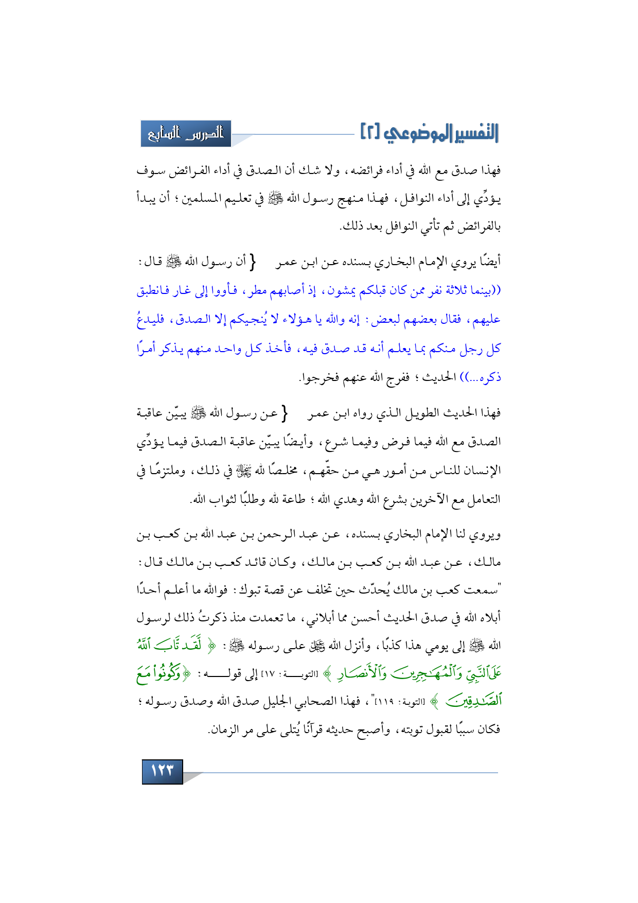 ويروي لنا الإمام البخاري بسنده عن عبد الرحمن بن عبد الله بن كعب بن مالك، عن عبد الله بن كعب بن مالك، وكان قائد كعب بن مالك قال: "سمعت كعب بن مالك يُحدّث حين تخلف عن قصة تبوك: فوالله ما أعلم أحدًا أبلاه الله في صدق الحديث أحسن مما أبلاني ما تعمدت منذ ذكرت ذلك لرسول الله -صلى الله عليه وسلم- إلى يوم هذا كذبًا، وأنزل الله -عز وجل- على رسوله -صلى الله عليه وسلم-: {لَقَدْ تَابَ اللهُ عَلَى النَّبِيِّ وَالْمُهَاجِرِينَ وَالْأَنْصَارِ} (التوبة: 17) إلى قوله: {وَكُونُوا مَعَ الصَّادِقِينَ} (التوبة: 119) "، فهذا الصحابي الجليل صدق الله وصدق رسوله فكان سببًا لقبول توبته، وأصبح حديثه قرآنًا يُتلى على مر الزمان.