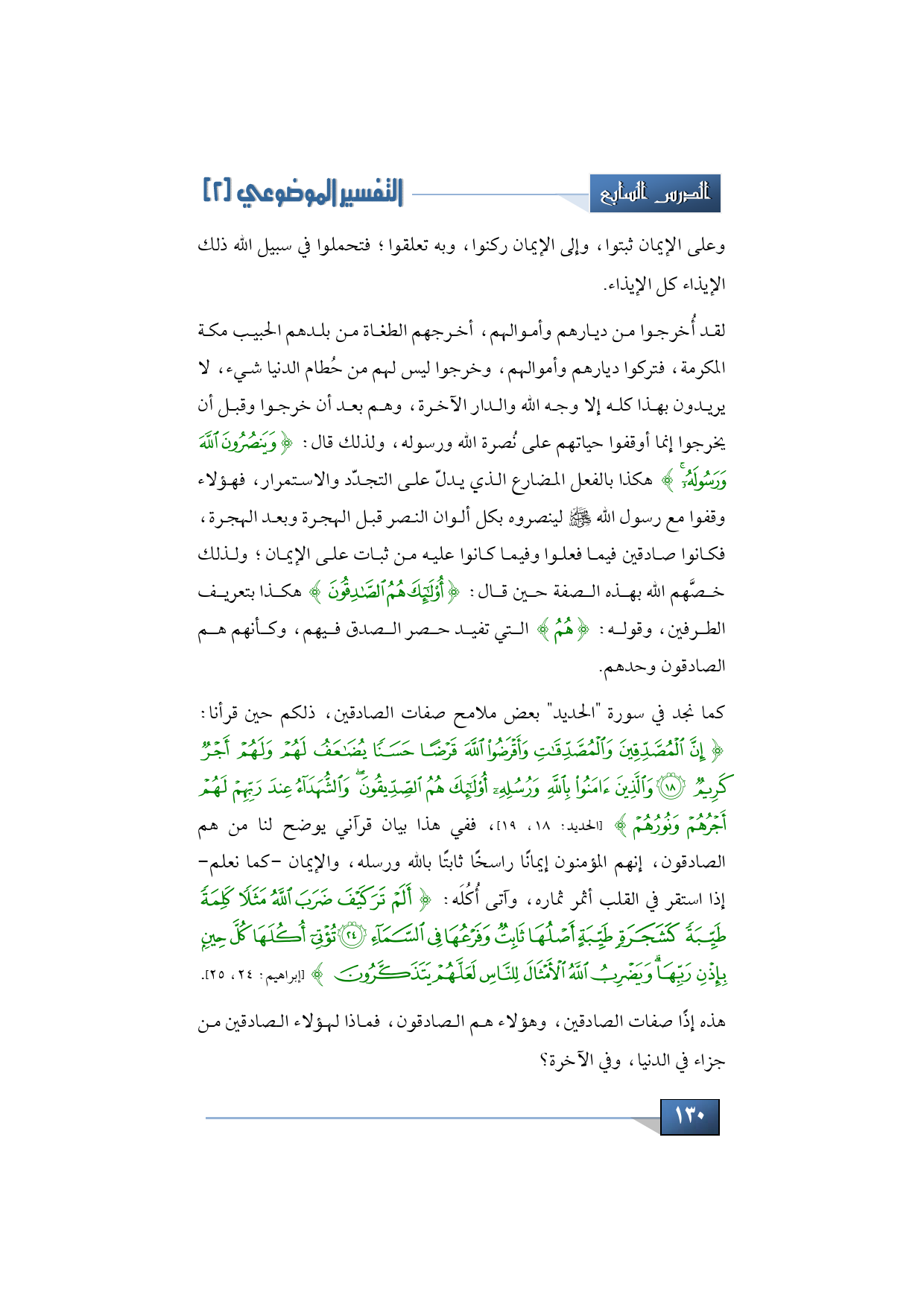 كما نجد في سورة "الحديد" بعض ملامح صفات الصادقين ذلكم حين قرأنا {إِنَّ الْمُصَّدِّقِينَ وَالْمُصَّدِّقَاتِ وَأَقْرَضُوا اللَّهَ قَرْضًا حَسَنًا يُضَاعَفُ لَهُمْ وَلَهُمْ أَجْرٌ كَرِيمٌ * وَالَّذِينَ آمَنُوا بِاللَّهِ وَرُسُلِهِ أُولَئِكَ هُمُ الصِّدِّيقُونَ وَالشُّهَدَاءُ عِنْدَ رَبِّهِمْ لَهُمْ أَجْرُهُمْ وَنُورُهُمْ} (الحديد: 18، 19) ففي هذا بيان قرآني يوضح لنا من هم الصادقون إنهم المؤمنون إيمانًا راسخًا ثابتًا بالله ورسله، والإيمان -كما نعلم- إذا استقر في القلب أثمر ثماره وآتى أكله: {أَلَمْ تَرَ كَيْفَ ضَرَبَ اللَّهُ مَثَلًا كَلِمَةً طَيِّبَةً كَشَجَرَةٍ طَيِّبَةٍ أَصْلُهَا ثَابِتٌ وَفَرْعُهَا فِي السَّمَاءِ * تُؤْتِي أُكُلَهَا كُلَّ حِينٍ بِإِذْنِ رَبِّهَا وَيَضْرِبُ اللَّهُ الْأَمْثَالَ لِلنَّاسِ لَعَلَّهُمْ يَتَذَكَّرُونَ} (إبراهيم: 25).