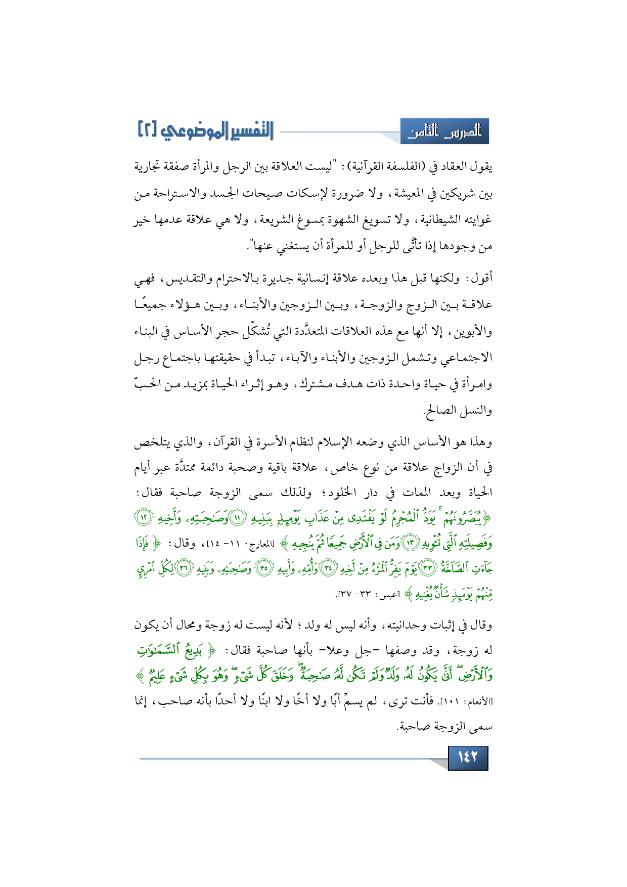 وهذا هو الأساس الذي وضعه الإسلام لنظام الأسرة في القرآن، والذي يتلخص في أن الزواج علاقة من نوع خاص، علاقة باقية وصحبة دائمة ممتدَّة عبر أيام الحياة وبعد الممات في دار الخلود، ولذلك سمى الزوجة صاحبة فقال: {يُبَصَّرُونَهُمْ يَوَدُّ الْمُجْرِمُ لَوْ يَفْتَدِي مِنْ عَذَابِ يَوْمِئِذٍ بِبَنِيهِ * وَصَاحِبَتِهِ وَأَخِيهِ * وَفَصِيلَتِهِ الَّتِي تُؤْوِيهِ * وَمَنْ فِي الْأَرْضِ جَمِيعًا ثُمَّ يُنْجِيهِ} (المعارج: 11 - 14)، وقال: {فَإِذَا جَاءَتِ الصَّاخَّةُ * يَوْمَ يَفِرُّ الْمَرْءُ مِنْ أَخِيهِ * وَأُمِّهِ وَأَبِيهِ * وَصَاحِبَتِهِ وَبَنِيهِ * لِكُلِّ امْرِئٍ مِنْهُمْ يَوْمَئِذٍ شَأْنٌ يُغْنِيهِ} (عبس: 33 - 37).