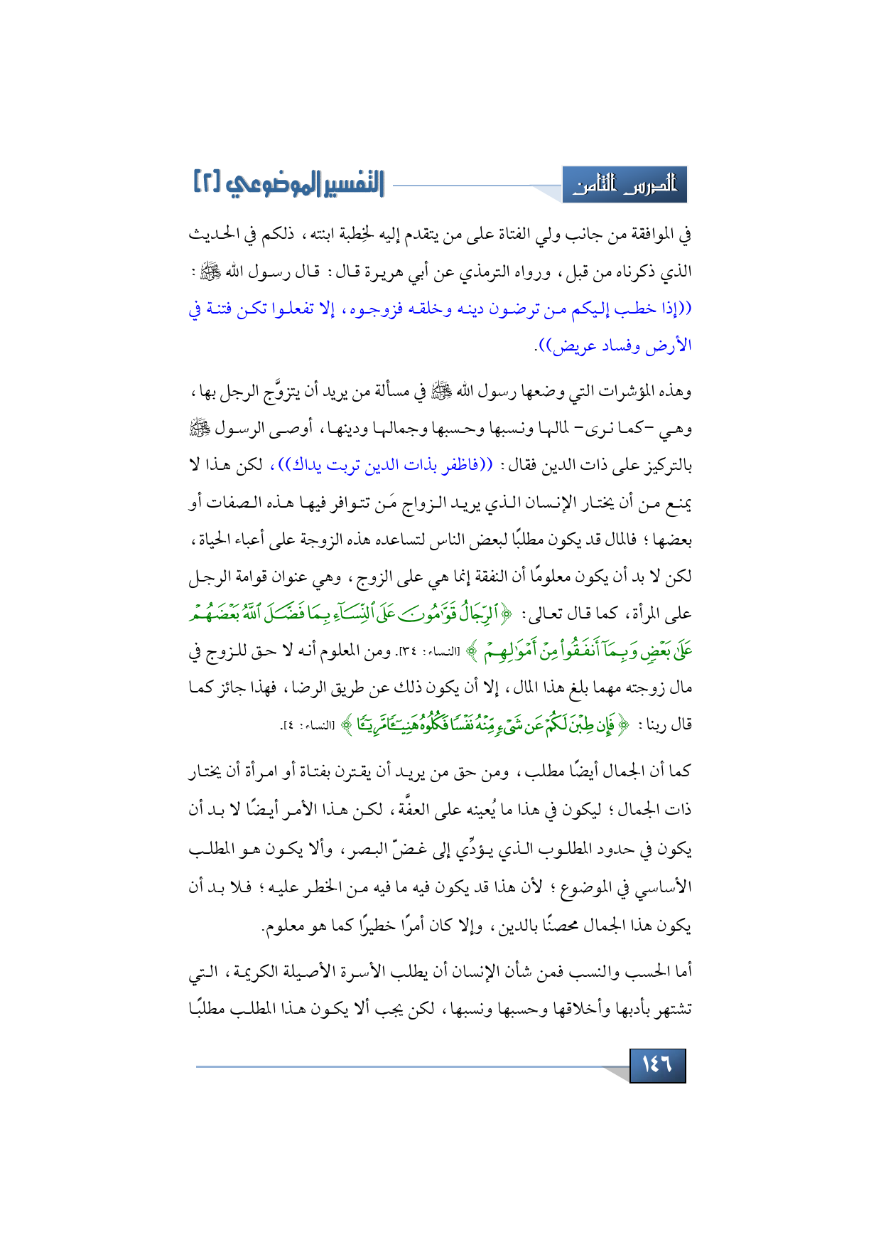 وهذه المؤشرات التي وضعها رسول الله -صلى الله عليه وسلم- في مسألة من يريد أن يتزوَّج الشاب بها، أو الرجل بها، وهي -كما نرى- لمالها ونسبها وحسبها وجمالها ودينها، فأوصى الرسول -صلى الله عليه وسلم- بالتركيز على ذات الدين فقال: ((فاظفر بذات الدين تربت يداك)) لكن هذا لا يمنع من أن يختار الإنسان الذي يريد الزواج مَن تتوافر فيها هذه الصفات أو بعضها؛ فالمال قد يكون مطلبًا لبعض الناس لتساعده هذه الزوجة على أعباء الحياة، لكن لا بد أن يكون معلومًا أن النفقة إنما هي على الزوج، وهي عنوان قوامة الرجل على المرأة، كما قال تعالى: {الرِّجَالُ قَوَّامُونَ عَلَى النِّسَاءِ بِمَا فَضَّلَ اللَّهُ بَعْضَهُمْ عَلَى بَعْضٍ وَبِمَا أَنْفَقُوا مِنْ أَمْوَالِهِمْ} (النساء: 34).