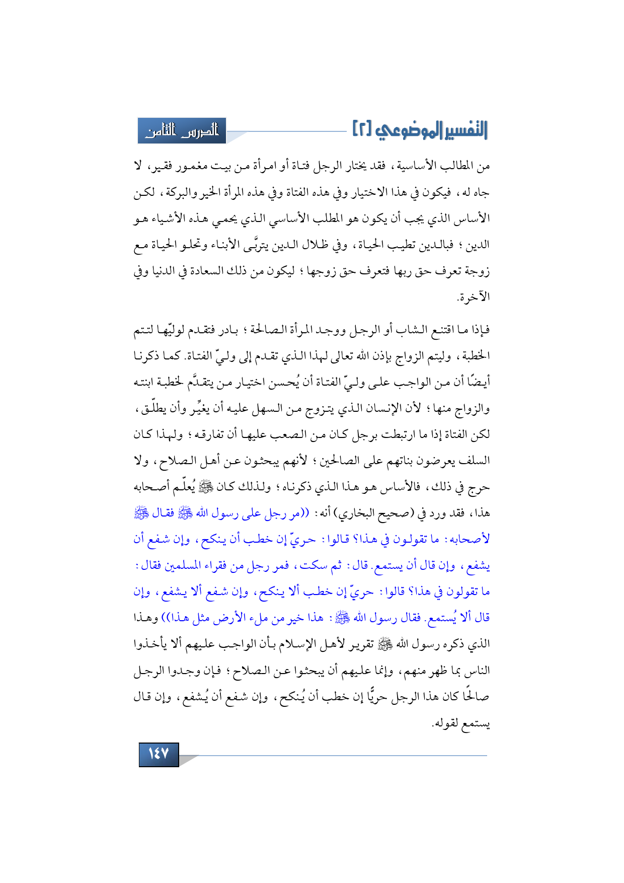 فإذا ما اقتنع الشاب أو الرجل ووجد المرأة الصالحة بادر فتقدم لوليّها؛ لتتم الخطبة، وليتم الزواج بإذن الله تعالى، هذا الذي تقدم إلى وليّ الفتاة كما ذكرنا أيضًا من الواجب على وليّ الفتاة أن يُحسن اختيار من يتقدَّم لخطبة ابنته والزواج منها؛ لأن الإنسان الذي يتزوج من السهل عليه أن يغيِّر وأن يطلق، لكن الفتاة إذا ما ارتبطت كرجل كان من الصعب عليها أن تفارقه، ولهذا كان السلف يعرضون بناتهم على الصالحين؛ لأنهم يبحثون عن أهل الصلاح، ولا حرج في ذلك. فالأساس هو هذا الذي ذكرناه، ولذلك كان -صلى الله عليه وسلم- يُعلّم أصحابه هذا اقرؤوا في (صحيح البخاري) ما ورد من أنه: ((مر رجل على رسول الله -صلى الله عليه وسلم- فقال -صلى الله عليه وسلم- لأصحابه: ما تقولون في هذا؟ قالوا: حريّ إن خطب أن ينكح، وإن شفع أن يشفع، وإن قال أن يستمع. قال: ثم سكت، فمر رجل من فقراء المسلمين فقال: ما تقولون في هذا؟ قالوا: حريّ إن خطب أن لا ينكح، وإن شفع ألا يشفع، وإن قال أن لا يُستمع. فقال رسول الله -صلى الله عليه وسلم-: هذا خير من ملء الأرض مثل هذا)) وهذا الذي ذكره رسول الله -صلى الله عليه وسلم- تقرير لأهل الإسلام بأن الواجب عليهم أن لا يأخذوا الناس بما ظهر منهم، وإنما عليهم أن يبحثوا عن الصلاح فإن وجدوا الرجل صالحًا؛ كان هذا الرجل حريًّا إن خطب أن يُنكح وإن شفع أن يُشفع، وإن قال يستمع لقوله.