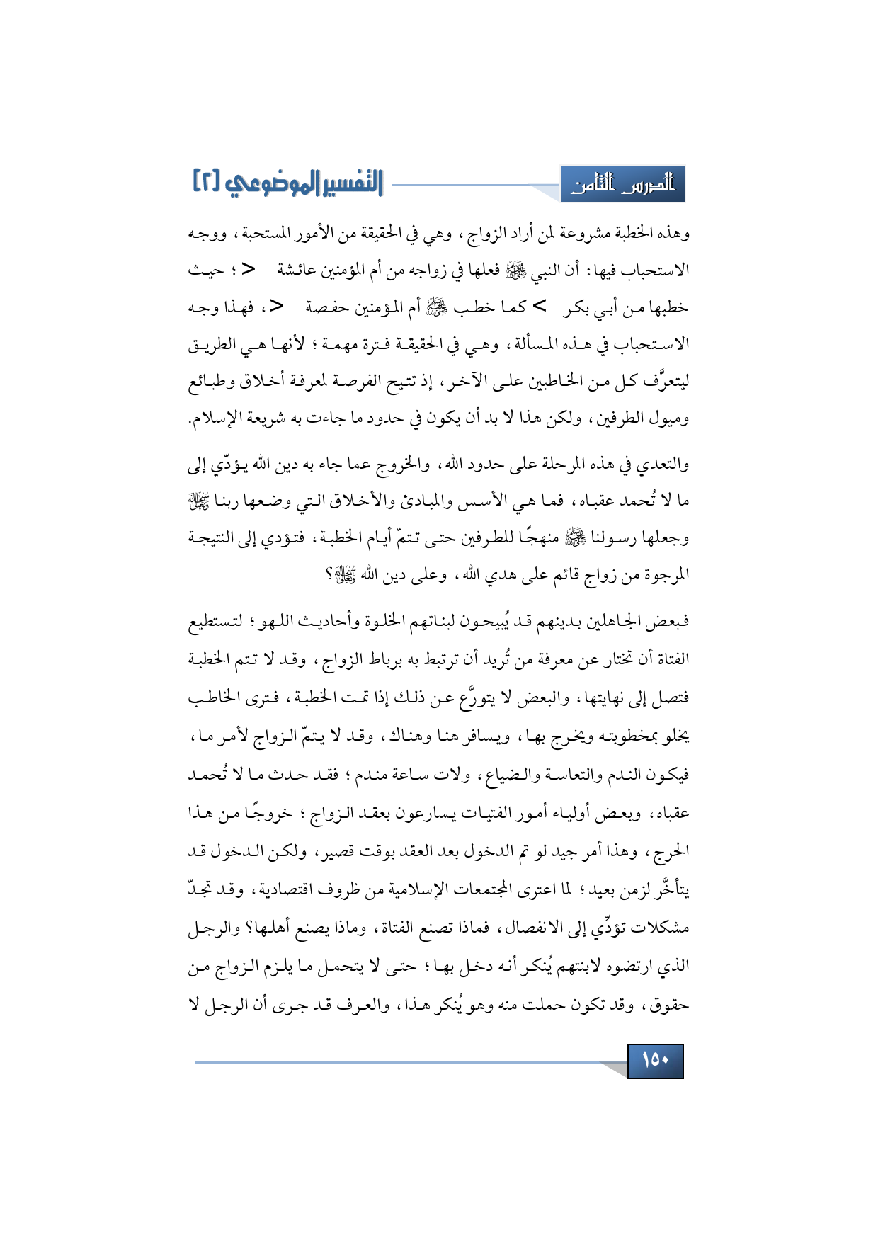 وهذه الخطبة مشروعة لمن أراد الزواج، وهي في الحقيقة من الأمور المستحبة، ووجه الاستحباب فيها أن النبي -صلى الله عليه وسلم- فعلها في زواجه من أم المؤمنين عائشة -رضي الله عنها-؛ حيث خطبها من أبي بكر -رضي الله عنه- كما خطب -عليه الصلاة والسلام- أم المؤمنين حفظة -رضي الله عنها-، فهذا وجه الاستحباب في هذه المسألة، وهي في الحقيقة فترة مهمة؛ لأنها هي الطريق ليتعرَّف كل من الخاطبين على الأخر، إذ تتيح الفرصة لمعرفة أخلاق وطبائع وميول الطرفين، ولكن هذا لا بد أن يكون في حدود ما جاءت به شريعة الإسلام.