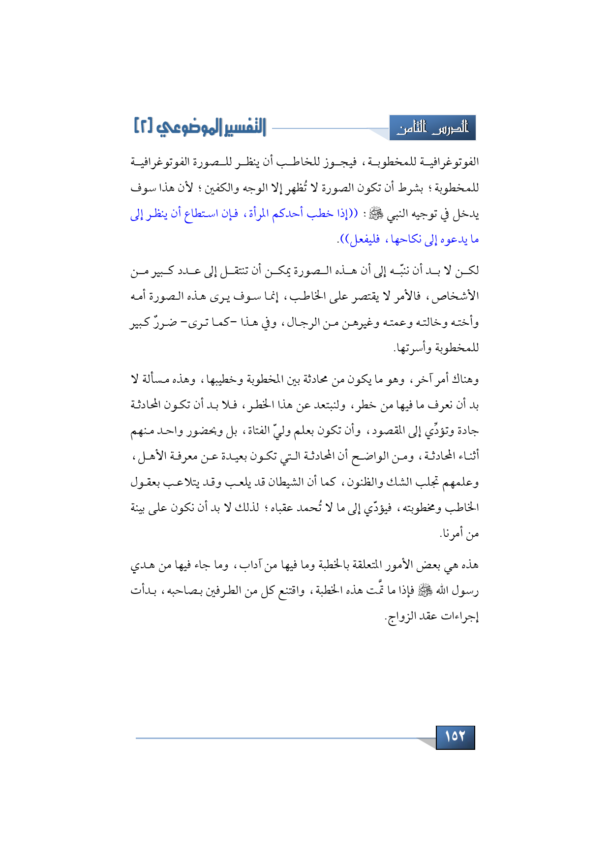 لكن لا بد أن ننبّه إلى أن هذه الصورة يمكن أن تنتقل إلى عدد كبير من الأشخاص، فالأمر لا يقتصر على الخاطب إنما سوف يرى هذه الصورة أمه وأخته وخالته وعمته وغيرهم من الرجال، وفي هذا -كما ترى- ضررٌ كبير للمخطوبة وأسرتها، وهناك أمر آخر وهو ما يكون محادثة بين المخطوبة وخطيبها، وهذه مسألة لا بد أن نعرف ما فيها من خطر، ولنبتعد عن هذا الخطر، لا بد أن تكون المحادثة جادة، وتؤدِّي إلى المقصود، وأن تكون بعلم وليّ الفتاة، بل وبحضور واحد منهم أثناء المحادثة، ومن الواضح أن المحادثة التي تكون بعيدة عن معرفة الأهل، وعلمهم تجلب الشك والظنون، كما أن الشيطان قد يلعب، وقد يتلاعب بعقول الخاطب ومخطوبته؛ فيؤدّي إلى ما لا تُحمد عقباه، لذلك لا بد أن نكون على بينة من أمرنا.