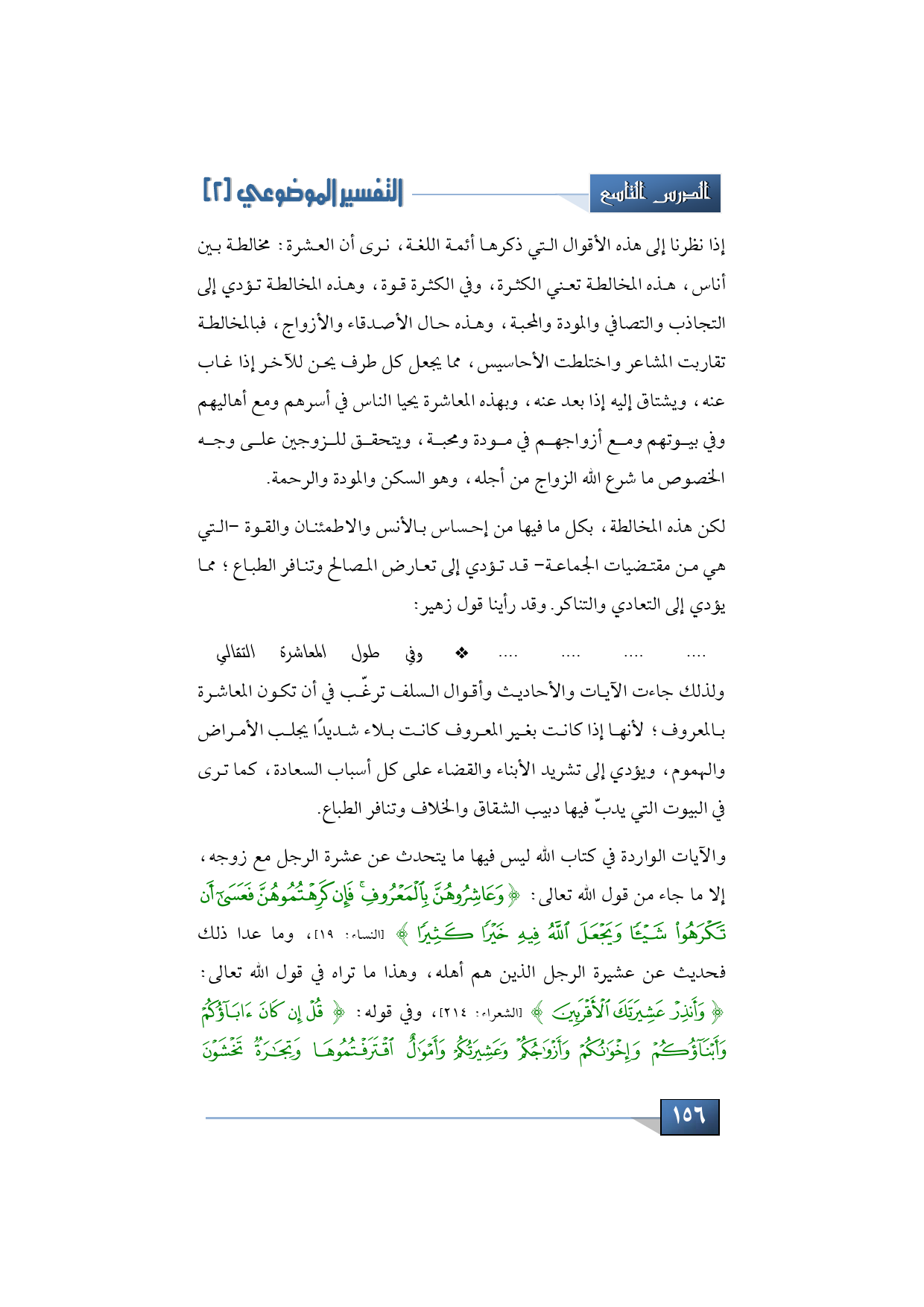 الآيات الواردة في كتاب الله ليس فيها ما يتحدث عن عشرة الرجل مع زوجه إلا ما جاء من قول الله تعالى: {وَعَاشِرُوهُنَّ بِالْمَعْرُوفِ فَإِنْ كَرِهْتُمُوهُنَّ فَعَسَى أَنْ تَكْرَهُوا شَيْئًا وَيَجْعَلَ اللَّهُ فِيهِ خَيْرًا كَثِيرًا} (النساء: 19) وما عدا ذلك حديث عن عشيرة الرجل الذين هم أهله، وهذا ما تراه في قول الله تعالى: {وَأَنْذِرْ عَشِيرَتَكَ الْأَقْرَبِينَ} (الشعراء: 214).