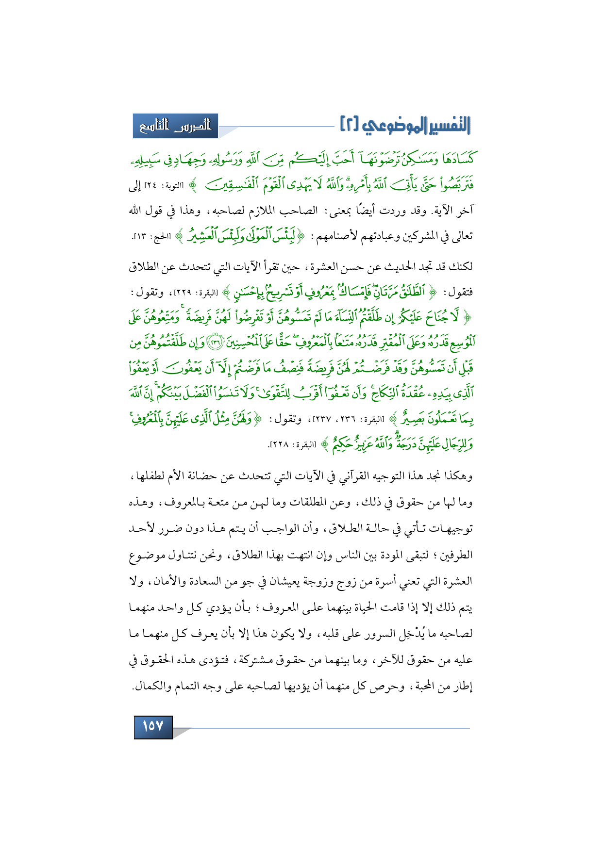 وهكذا نجد هذا التوجيه القرآني في الآيات التي تتحدث عن حضانة الأم لطفلها، وما لها من حقوق في ذلك، وعن المطلقات وما لهن من متعة بالمعروف، وهذه توجيهات تأتي في حالة الطلاق، وأن الواجب أن يتم هذا دون ضرر لأحد الطرفين؛ لتبقى المودة بين الناس وإن انتهت بهذا الطلاق، ونحن كما تعلمون نتناول موضوع العشرة التي تعني أسرة من زوج وزوجة، يعيشان في جو من السعادة والأمان.