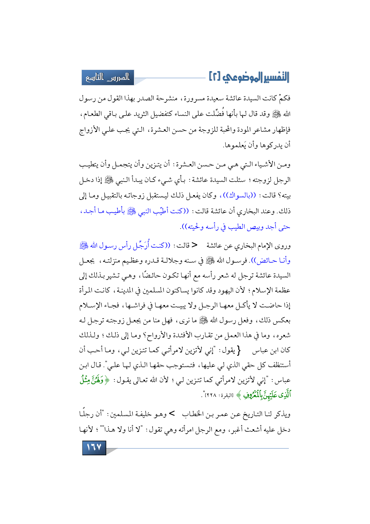 وهي تشير بذلك إلى عظمة الإسلام؛ لأن اليهود وقد كانوا يساكنون المسلمين في المدينة، كانت المرأة إذا حاضت لا يأكل معها الرجل ولا يبيت معها في فراشها، فجاء الإسلام بعكس ذلك، وفعل رسول الله -صلى الله عليه وسلم- ما نرى، فهل منا من يجعل زوجته تسرح له شعره، وماذا في هذا العمل من تقارب الأفئدة والأرواح، وما إلى ذلك، ولذلك كان ابن عباس -رضي الله تعالى عنهما- يقول: "إني لأتزين لامرأتي كما تتزين لي، وما أحب أن أستعطف كل حقي الذي لي عليها، فتستوجب حقها الذي لها علي". قال ابن عباس: "إني لأتزين لامرأتي كما تتزين لي؛ لأن الله تعالى يقول: {وَلَهُنَّ مِثْلُ الَّذِي عَلَيْهِنَّ بِالْمَعْرُوفِ} ".