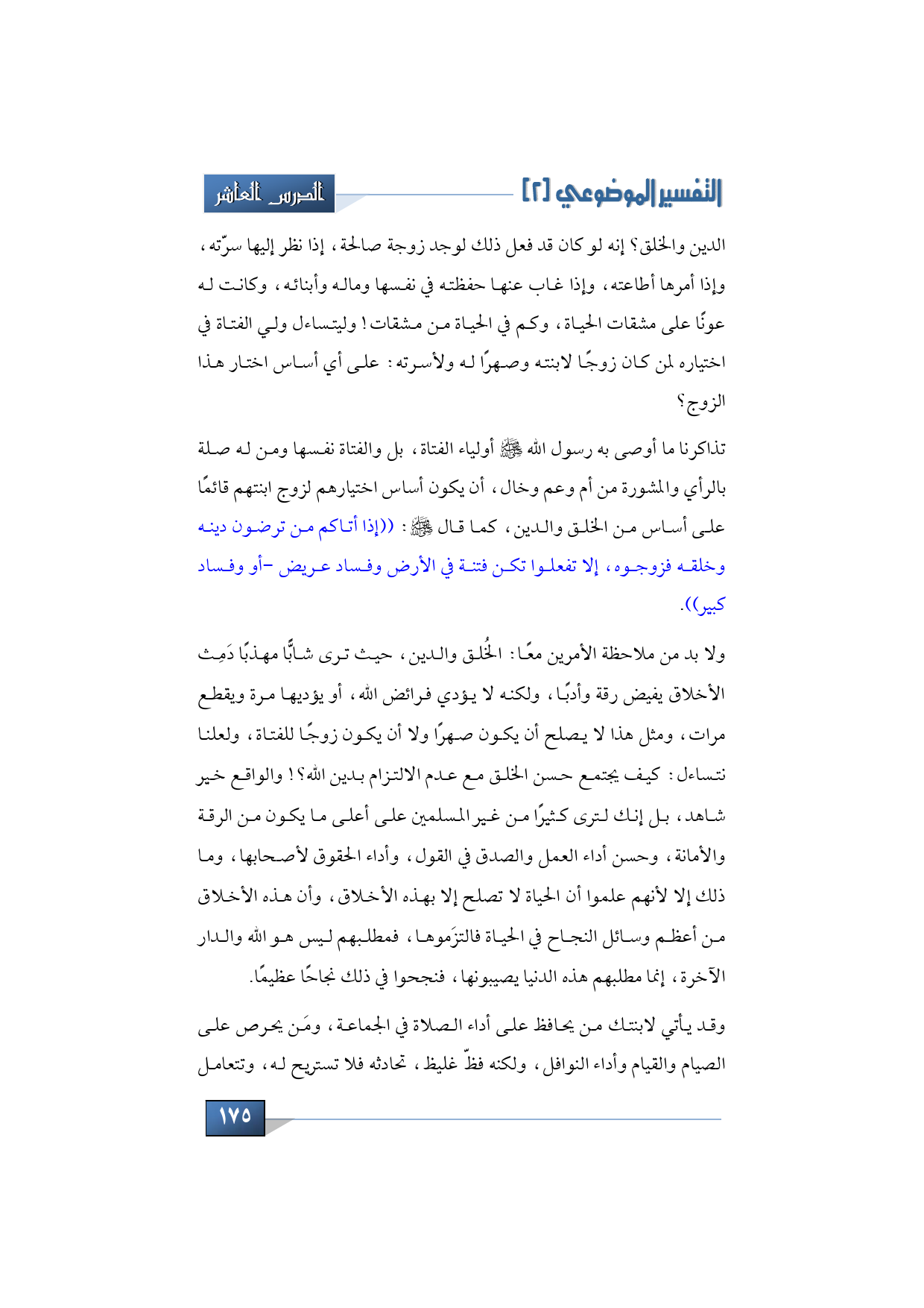 الدين والخلق؟ إنه لو كان قد فعل ذلك لوجد زوجة صالحة، إذا نظر إليها سرته، وإذا أمرها أطاعته، وإذا غاب عنها حفظته في نفسها وماله وأبنائه، وكانت له عونًا على مشقات الحياة، وكم في الحياة من مشقات، وولي الفتاة في اختياره لمن سيكون زوجًا لابنته وصهرًا له ولأسرته على أي أساس اختار هذا الزوج؟.