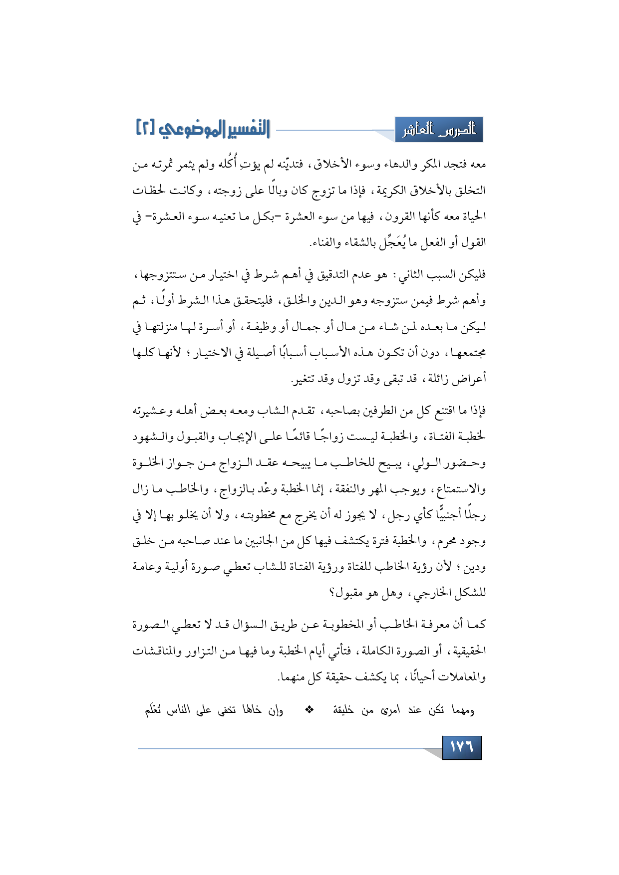 فليكن هو السبب الثاني: وهو عدم التدقيق في أهم شرط في اختيار من ستتزوجها، وأهم شرط فيمن ستزوجه وهو الدين والخلق، فليتحقق هذا الشرط أولًا، ثم ليكن ما بعده لمن شاء من مال أو جمال أو وظيفة، أو أسرة لها منزلتها في مجتمعها، دون أن تكون هذه الأسباب أسبابًا أصيلة في الاختيار؛ لأنها كلها أعراض زائلة قد تبقى وقد تزول وقد تتغير.