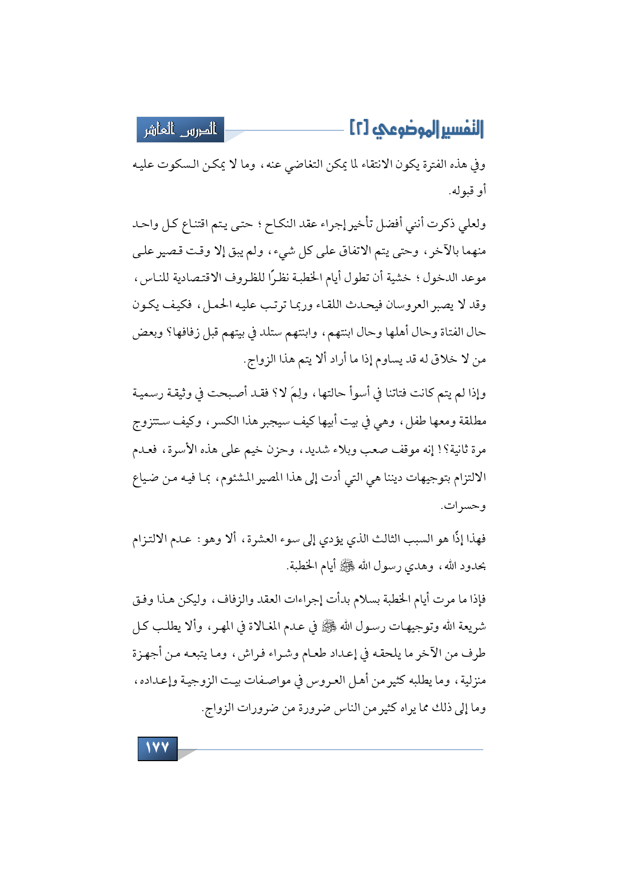 فهذا إذًا هو السبب الثالث الذي يؤدي إلى سوء العشرة، ألا وهو عدم الالتزام بحدود الله وهدي رسول الله -صلى الله عليه وسلم- أيام الخطبة.