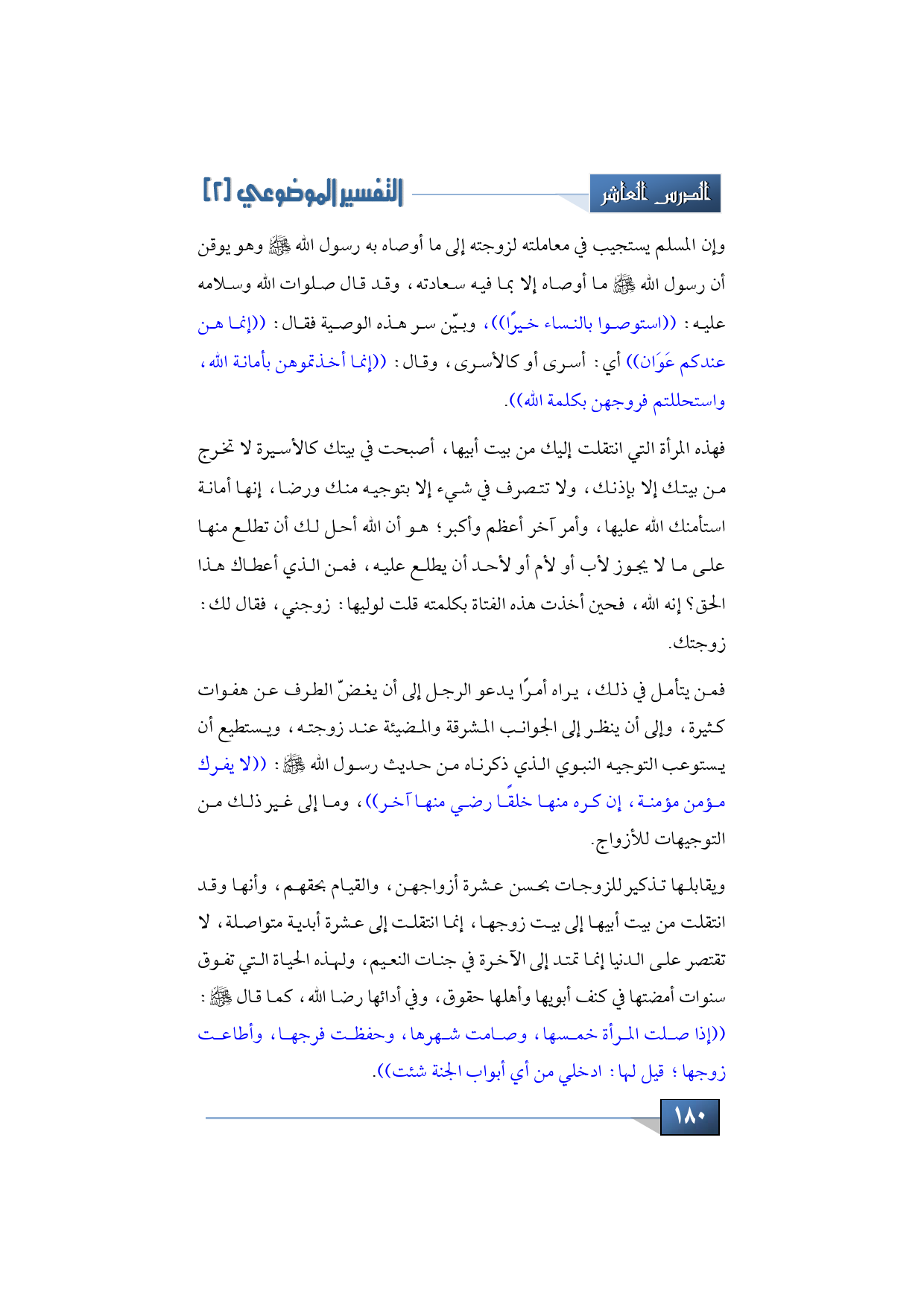 إلى غير ذلك من التوجيهات للأزواج، ويقابلها تذكير للزوجات بحسن عشرة أزواجهن، والقيام بحقهم، وأنها وقد انتقلت من بيت أبيها إلى بيت زوجها، إنما انتقلت إلى عشرة أبدية متواصلة، لا تقتصر على الدنيا، إنما تمتد إلى الآخرة في جنات النعيم، ولهذه الحياة التي تفوق سنوات أمضتها في كنف أبويها وأهلها حقوق في أدائها رضا الله، كما قال -صلى الله عليه وسلم-: ((إذا صلت المرأة خمسها، وصامت شهرها، وحفظت فرجها، وأطاعت زوجها قيل لها: ادخلي من أي أبواب الجنة شئت)).